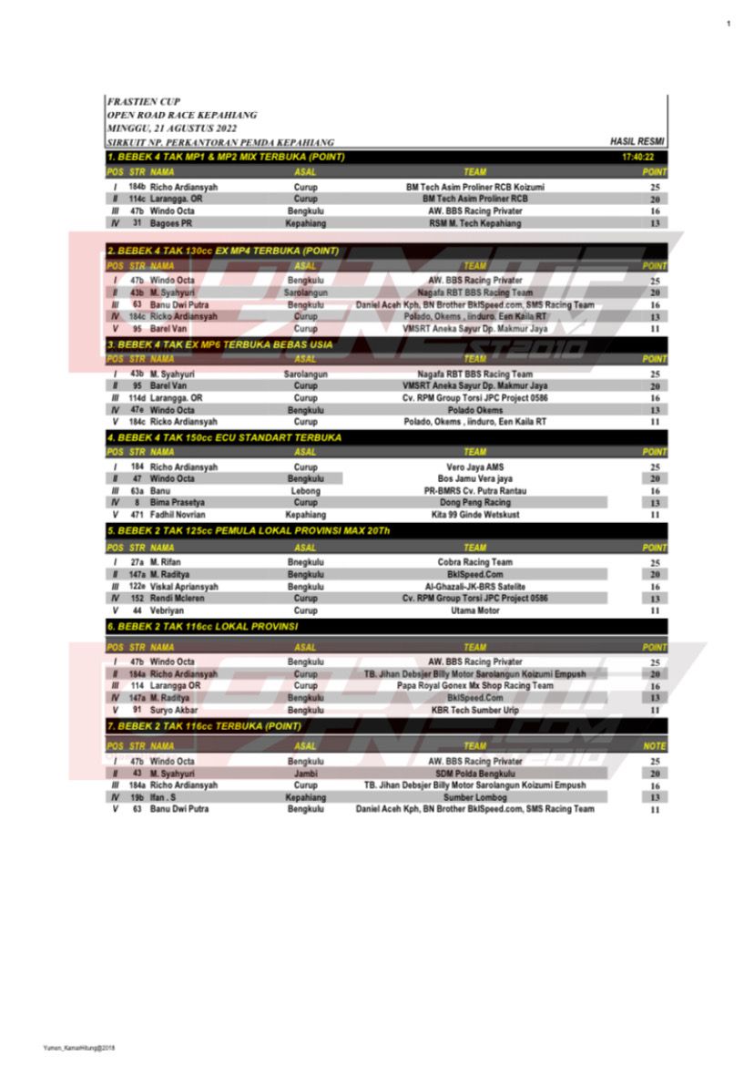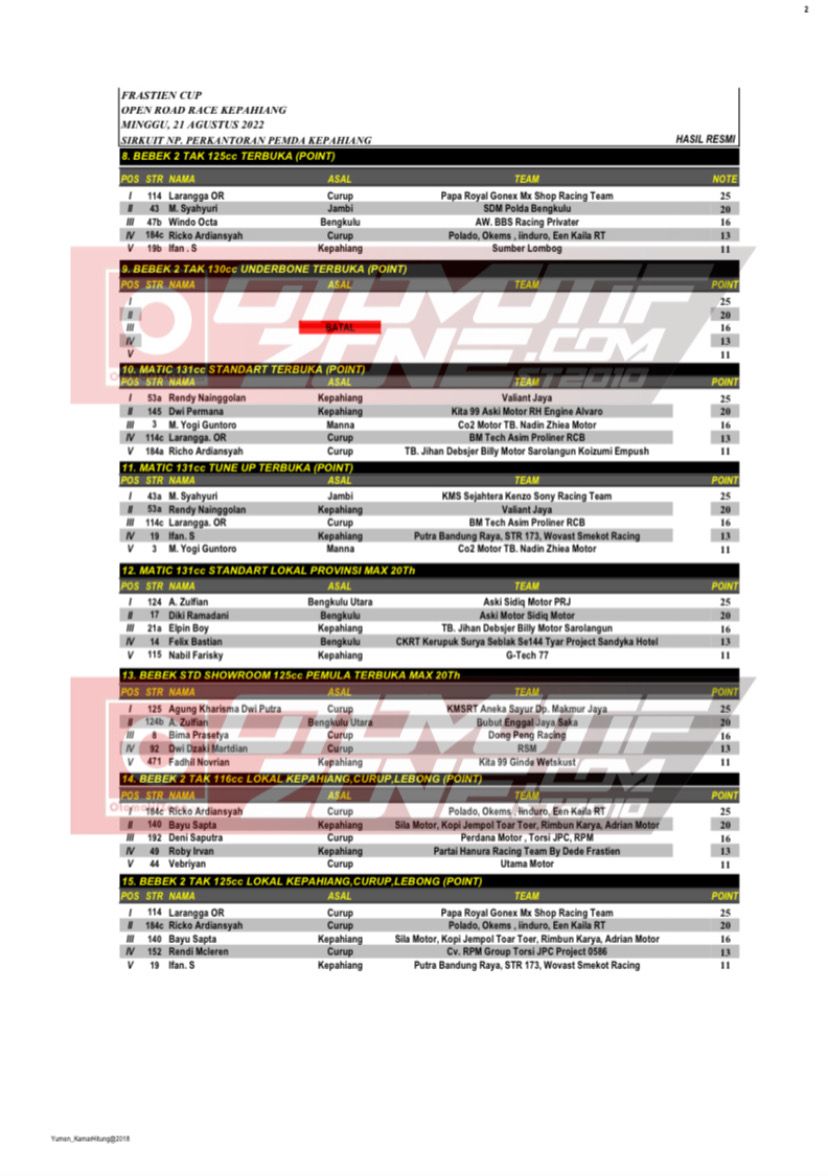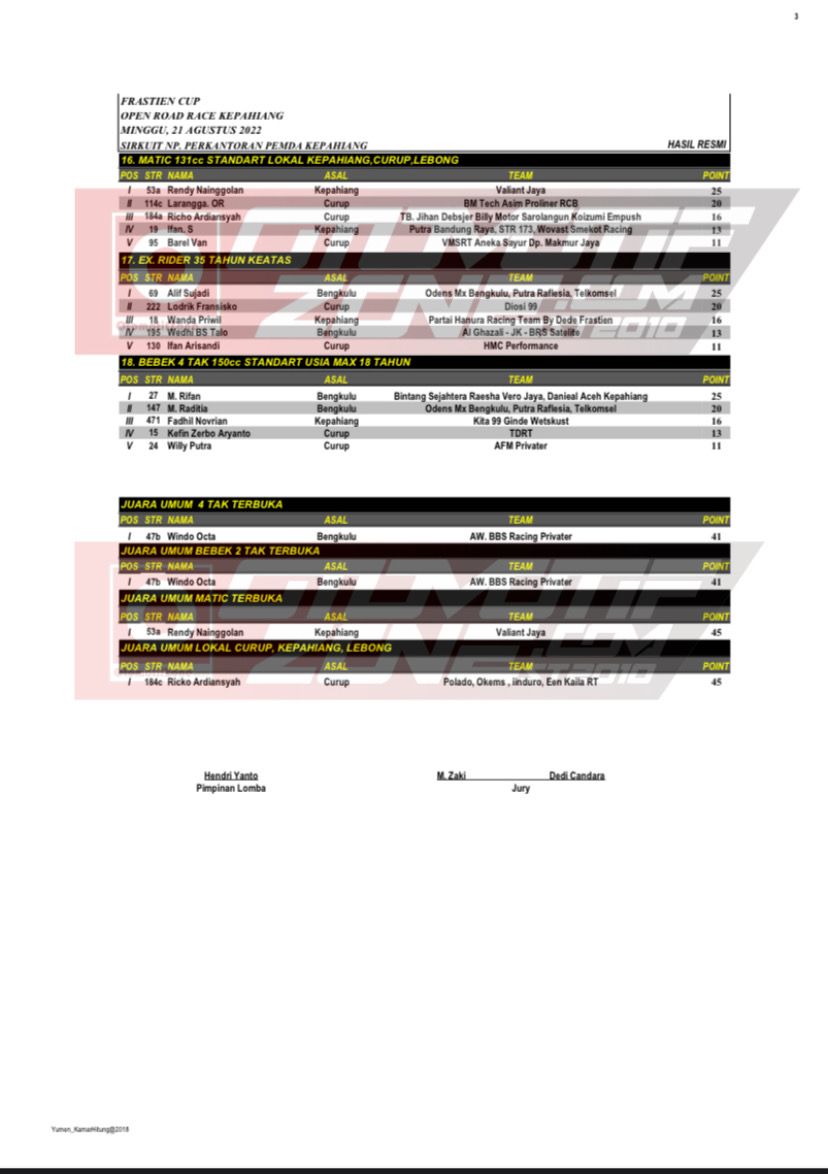 Alhamdulillah meski begitu, event Frastien Cup Open Road Race Championship berjalan lancar dan aman, walaupun ada beberapa insiden yang terjadi tetapi sudah diselesaikan oleh pihak Pengprov IMI Bengkulu. Nah Otonozer berikut adalah hasil lombanya, yang berhasil Penulis rangkum spesial untuk kalian: