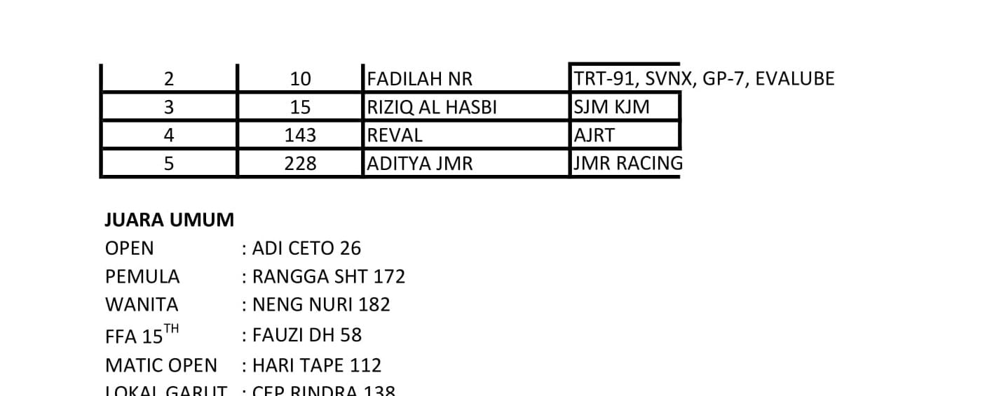Racing Roda 2GrasstrackRace Results Hasil Lomba Garut Open Grasstrack 2019 Penulis OtomotifZone.com - 27 Februari 2019 0 2890 FacebookXPinterestWhatsApp OtomotifZone.com – Garut. Berikut ini adalah hasil lomba Garut Open Grasstrack 2019 yang berlangsung di sirkuit Sampalan Malangbong, Garut, Minggu (24/2).