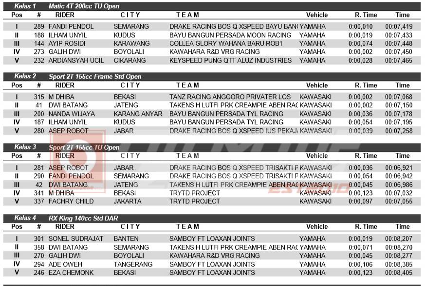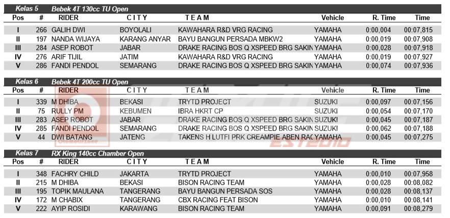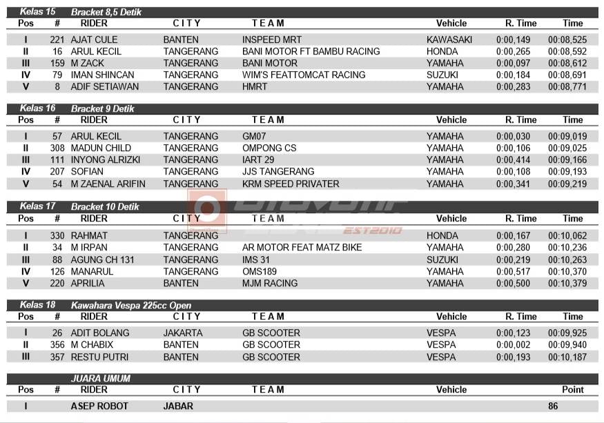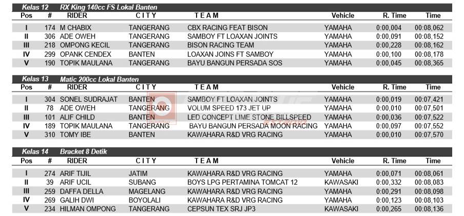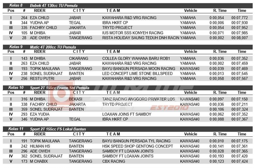 Beberapa tim besar dan tim ternama asal Banten ikut bersaing dalam pagelaran ini. Mereka saling adu kecepatan untuk menjadi yang terbaik. Meski beberapa pebalap ada yang nampak gerogi terutama ketika bertemu dengan pebalap senior Drag Bike. Tapi semua kelas berhasil diselenggarakan dan tidak ada kekurangan.