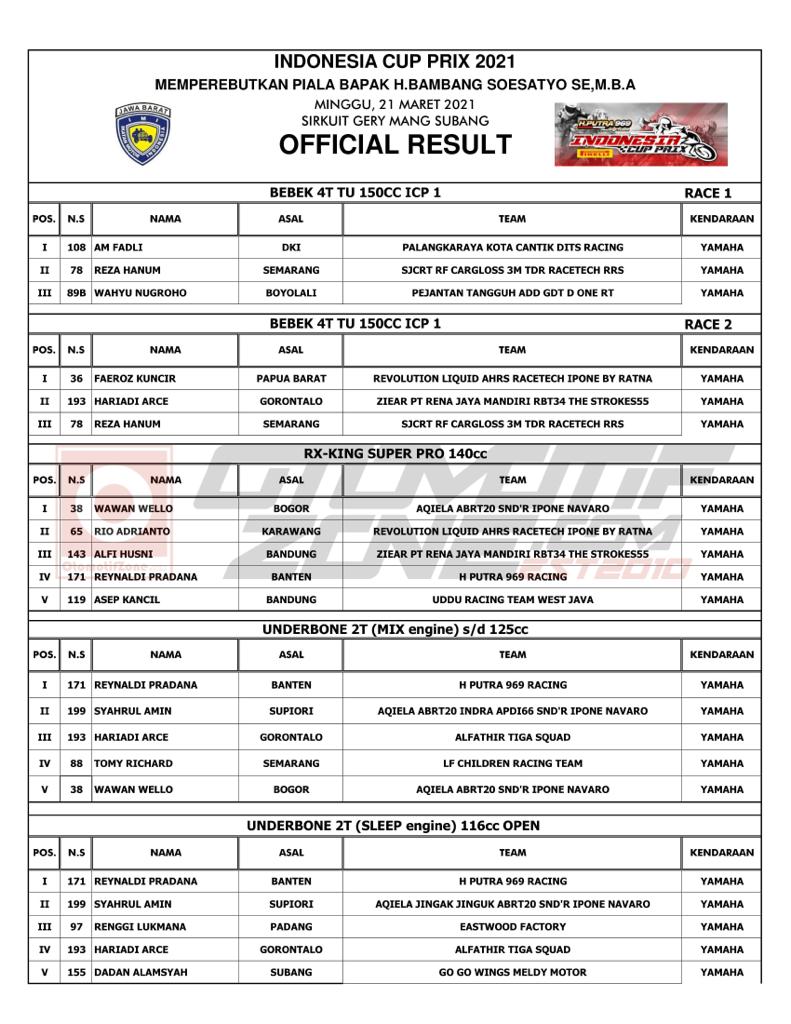 OtomotifZone.com – Subang. Usai sudah gelaran balap motor Indonesia Cup Prix 2021 sekaligus memperebutkan piala Bapak H. Bambang Soesatyo SE, M.B.A yang berlangsung di sirkuit Gery Mang, Subang, Jawa Barat, (21/3).