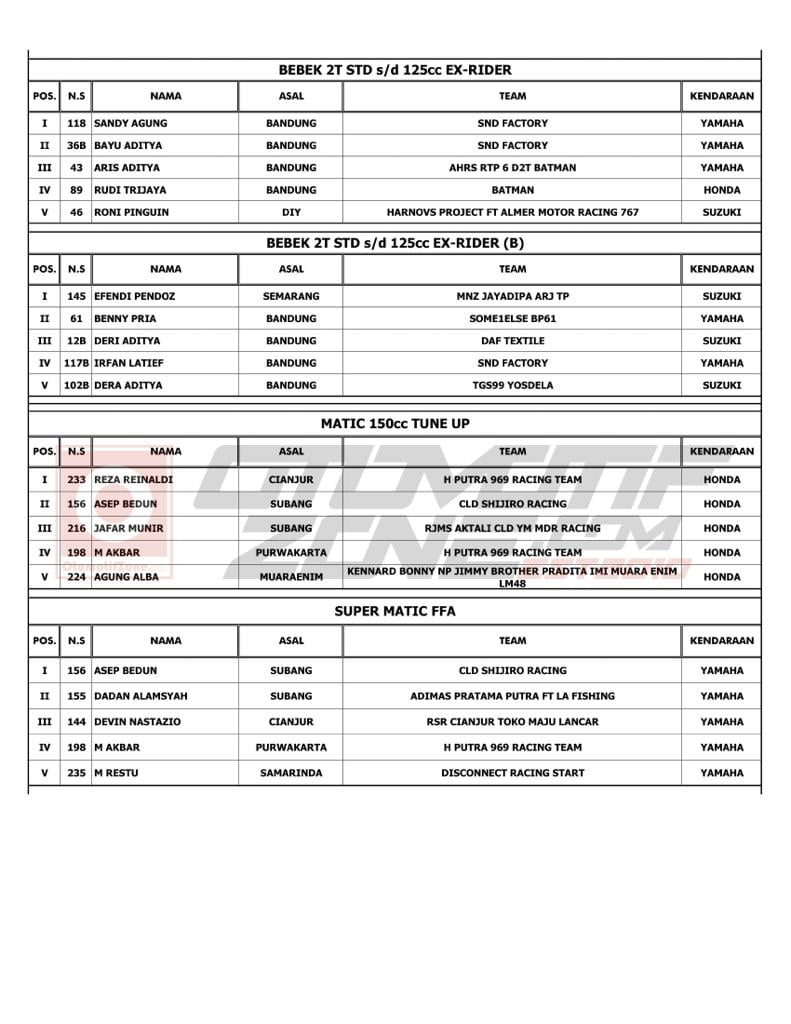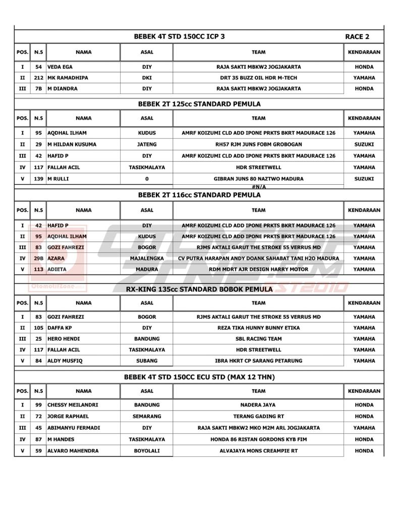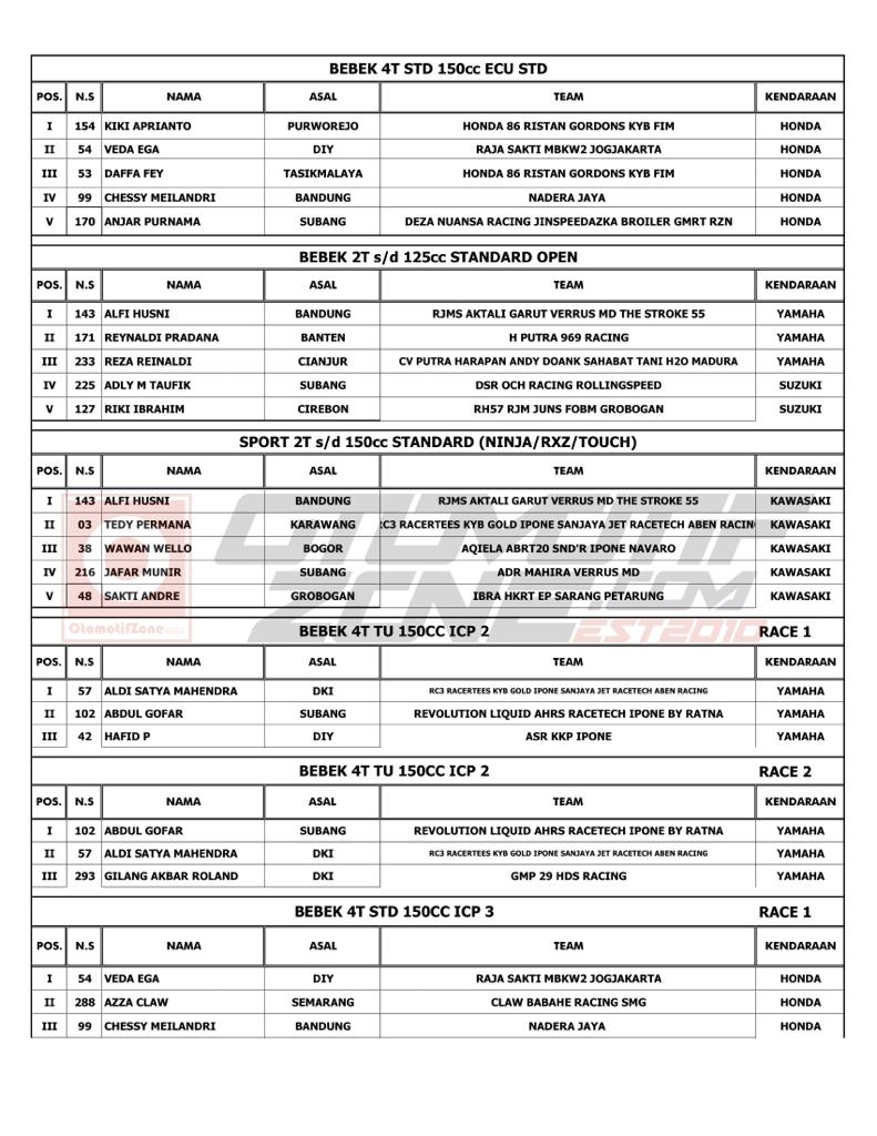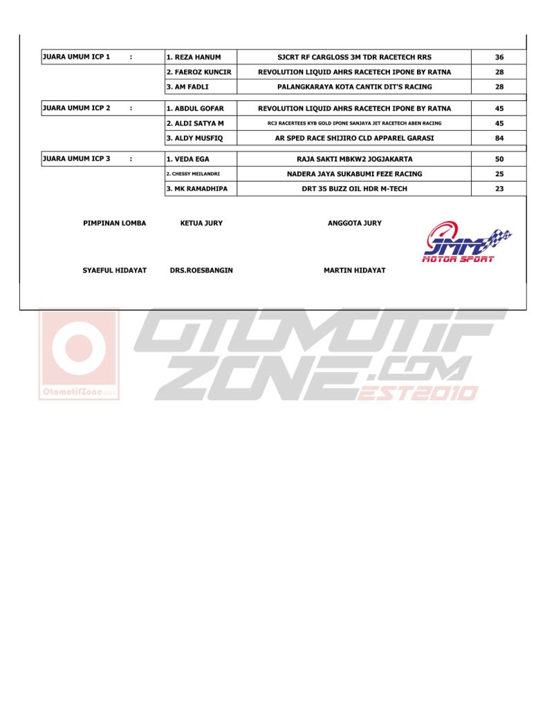 Selain daftar juara di tiap kelasnya, ada pula 3 kategori untuk Juara Umum ICP 1, ICP 2 dan ICP 3 yang masing-masing diantaranya terdapat 3 pemenang.
