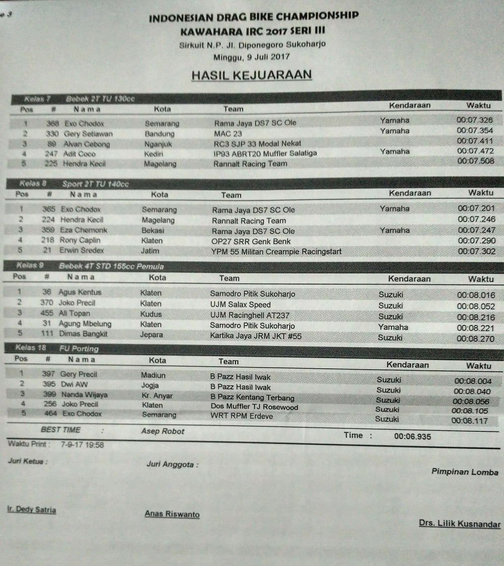 Racing Roda 2Drag BikeRace Results Hasil Lomba Indonesian Drag Bike Championship Kawahara IRC 2017 Seri 3 Penulis OtomotifZone.com - 9 Juli 2017 0 6140 FacebookXPinterestWhatsApp OtomotifZone.com-Sukoharjo. Berikut Hasil Lomba Indonesian Drag Bike Championship Kawahara IRC 2017 Seri 3 di Sirkuit N.P. Jl. Diponegoro Sukoharjo, minggu 9 Juli 2017. Penulis : Rifqi Libero | Foto : Rifqi Libero