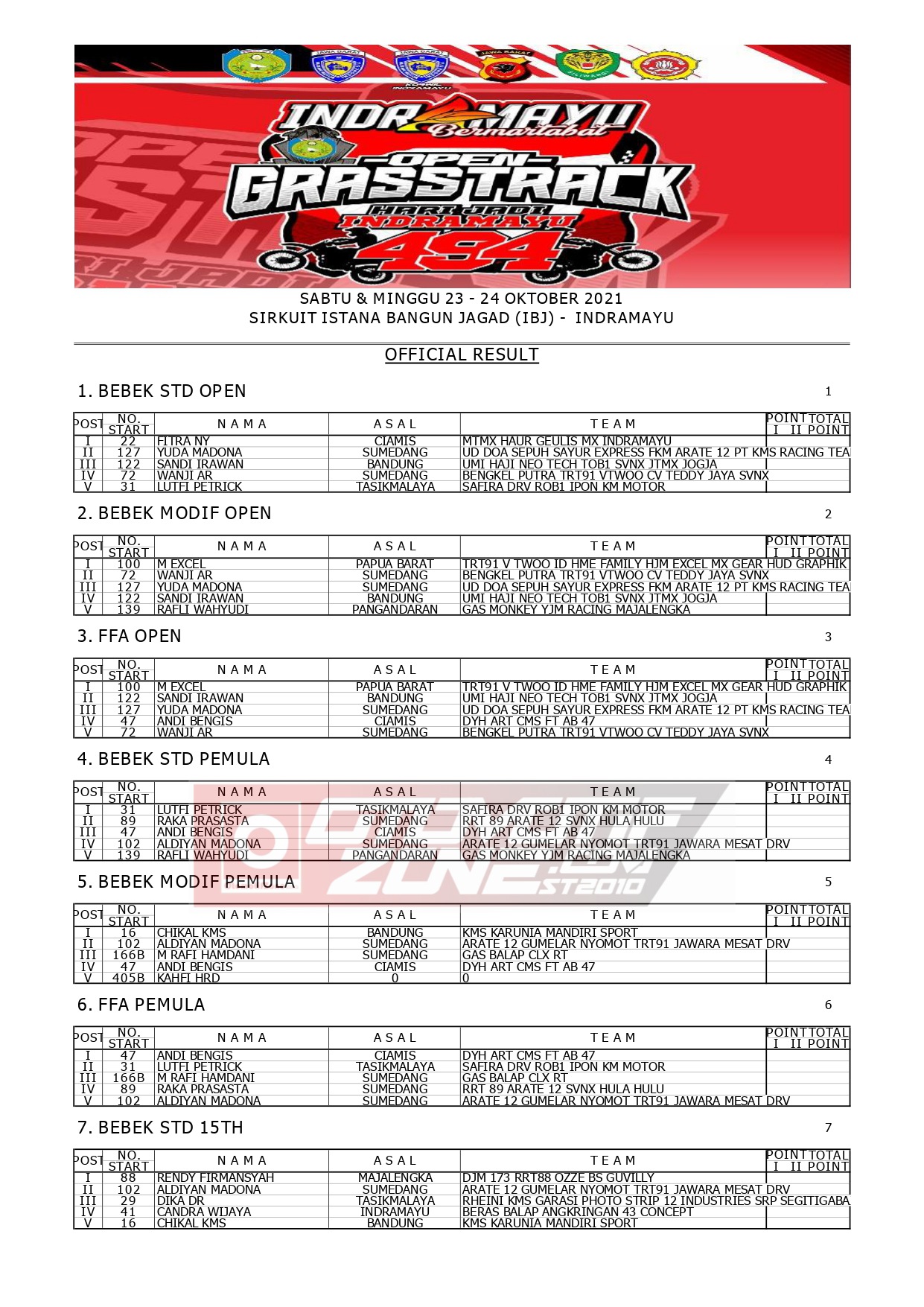 OtomotifZone.com – Indramayu. Gelaran balap bertajuk Indramayu Bermartabat Open Grasstrack 2021, berlangsung di sirkuit Satria Pringgandani H. Gorry, Balongan, Indramayu, Jawa Barat, (23-24/10). Ada enam kategori untuk gelar Juara Umum di kelas pilihan, dan jadi rebutan para pembalap yang tercatat ada 211 starter di event yang diselenggarakan oleh Wiralodra Racing Club.