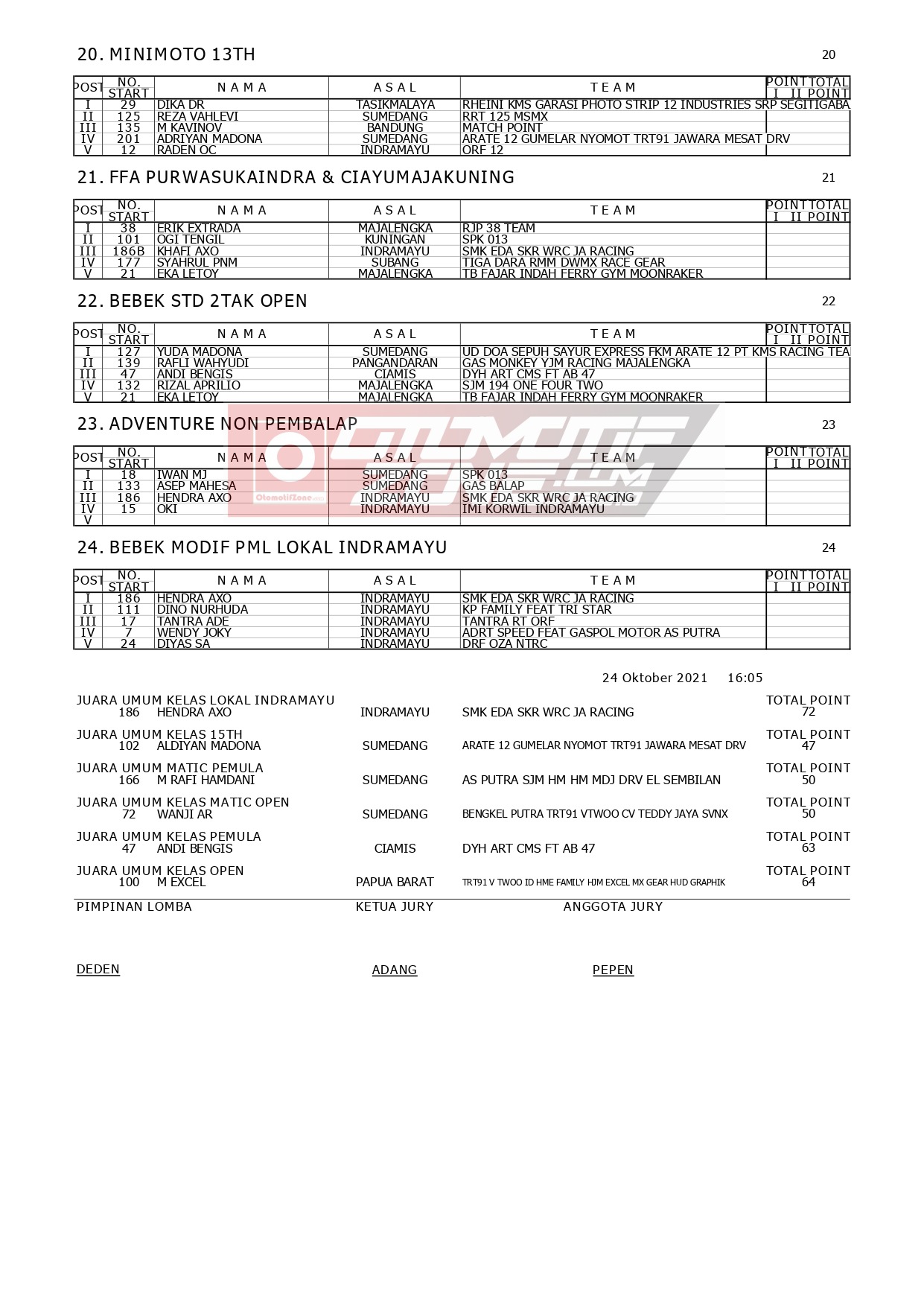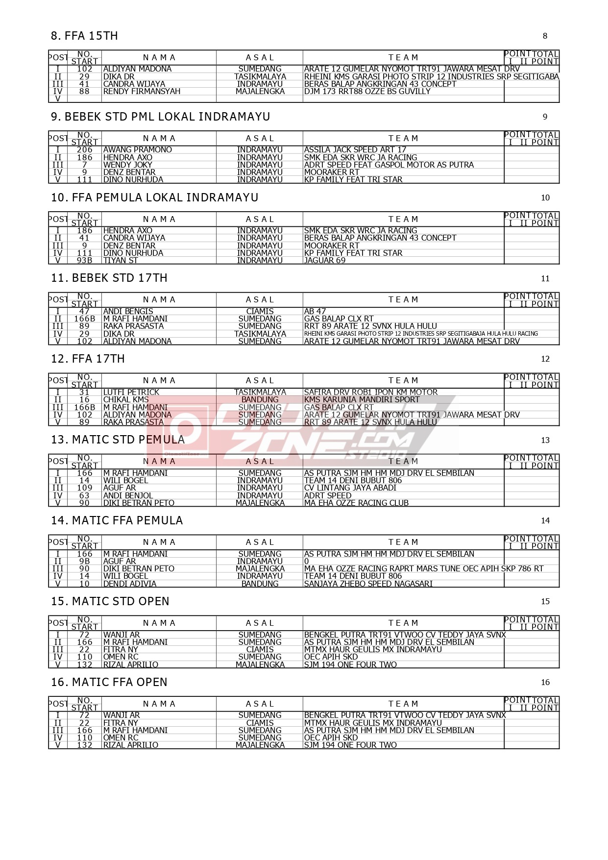 Diantaranya adalah Juara Umum kelas Open, Juara Umum kelas Pemula, Juara Umum kelas Matik Open, Juara Umum kelas Matik Pemula, Juara Umum kelas 15 Tahun dan Juara Umum kelas Lokal Indramayu.