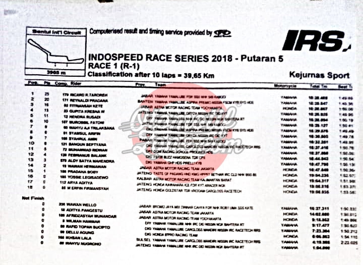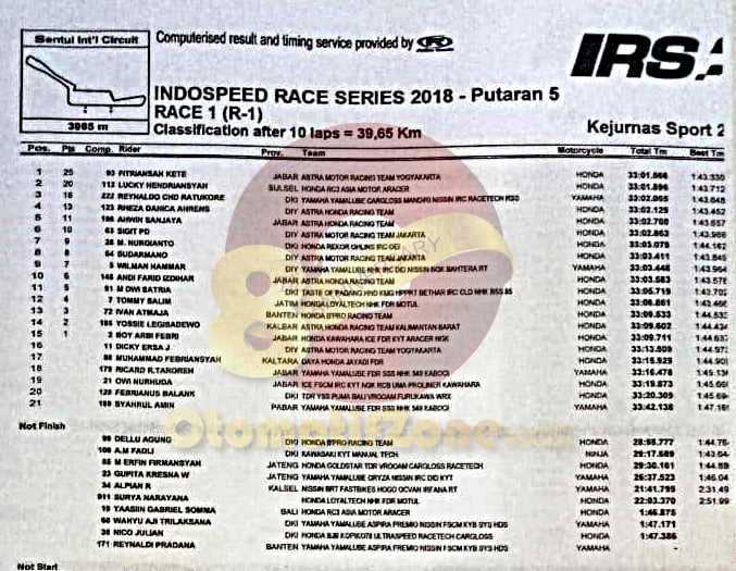OtomotifZone.com – Jakarta. IRS putaran 5 berhasil diselenggarakan (13/12) di Sirkuit Internasional Sentul Bogor, Jawa Barat. Dengan selesainya ajang balap motor bertaraf Kejurnas ini menjadikan selesai sudah musim kompetisi nasional 2018. Di putaran 5 ini kita mendapatkan siapa saja yang menjadi juara umum disetiap kelasnya. Meski kita tau, kelas Kejurnas Sport 150 sudah dipegang Ricard Taroreh sejak putaran 4. Untuk hasil juara di putaran 5, berikut hasil lombanya: [Penulis/ Foto: Dewantara]