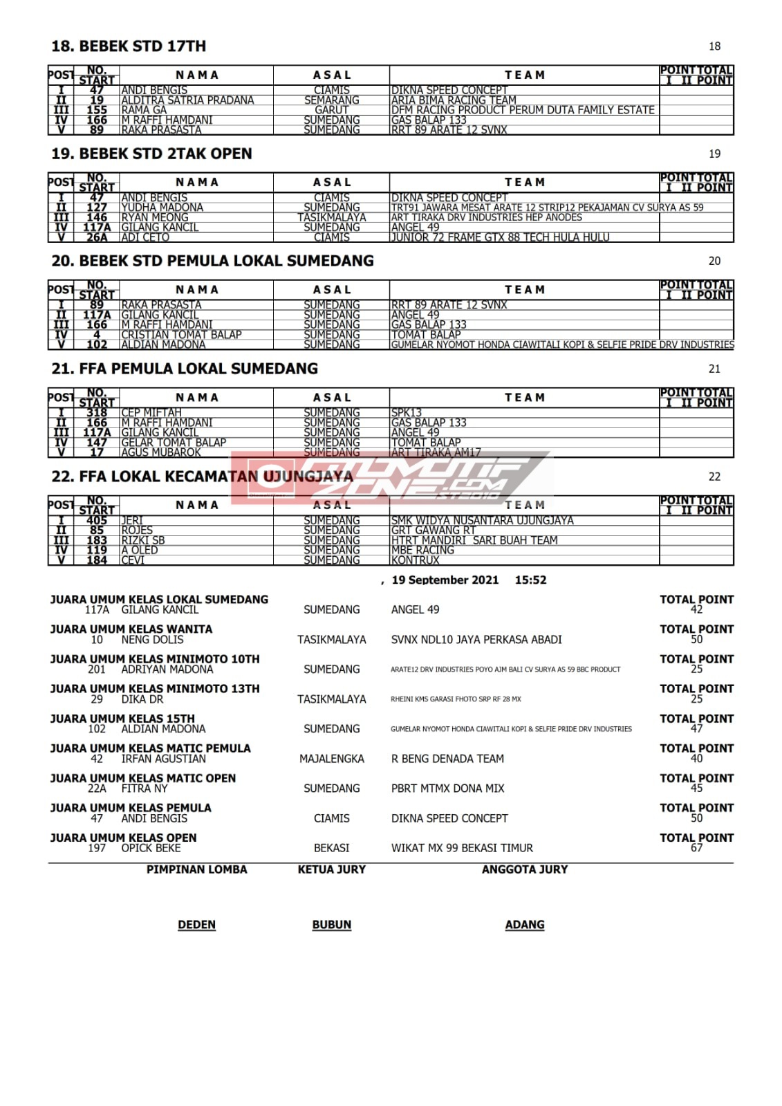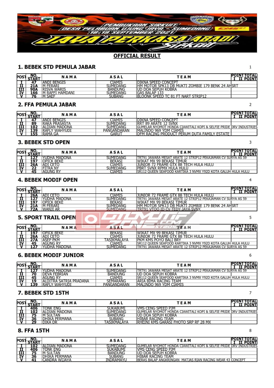 OtomotifZone. Sumedang. Dasi hasil lomba Jaya Perkasa Abadi Grasstrack 2021, yang berlangsung di Desa Palabuan, Ujungjaya, Kabupaten Sumedang, Jawa Barat, Sabtu-Minggu (18/19/9), sukses di gelar dengan menghasilkan 9 kategori Juara Umum.