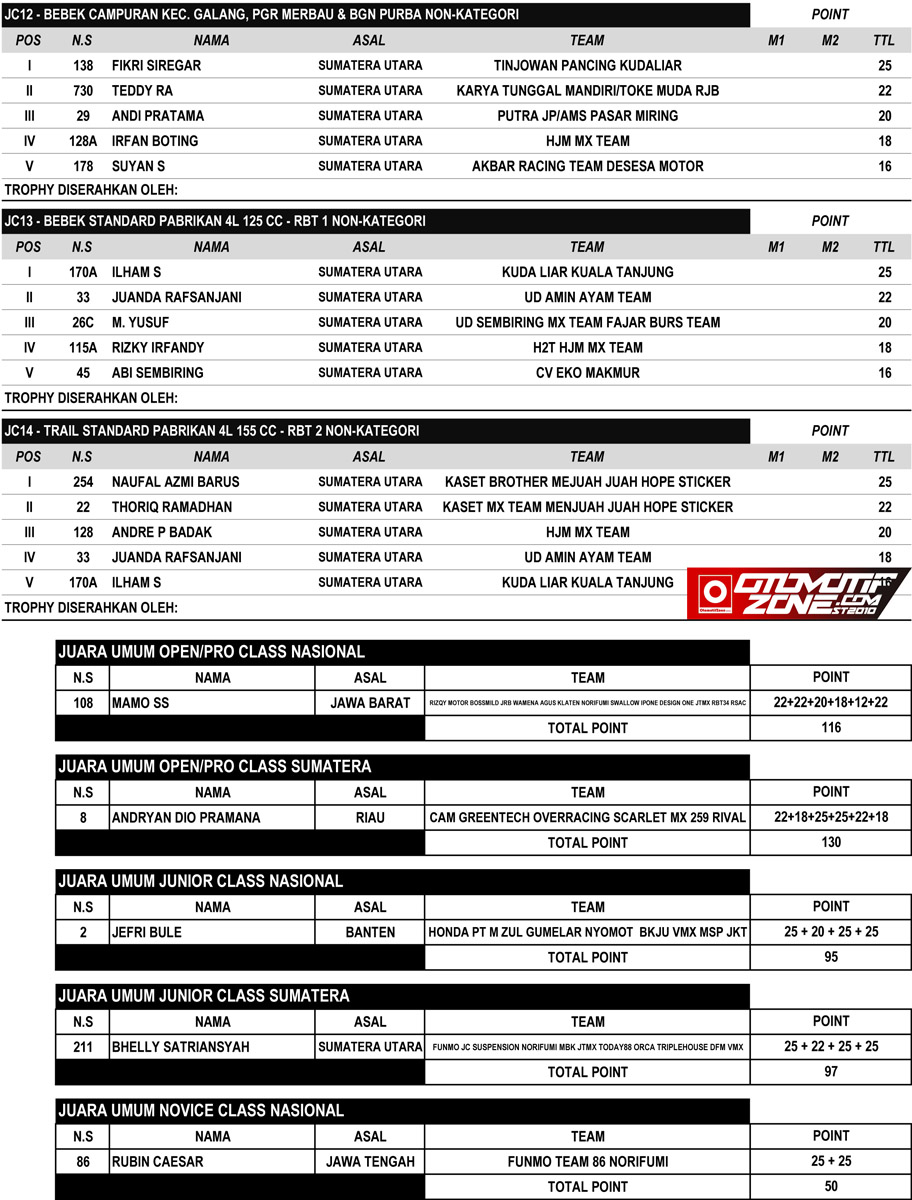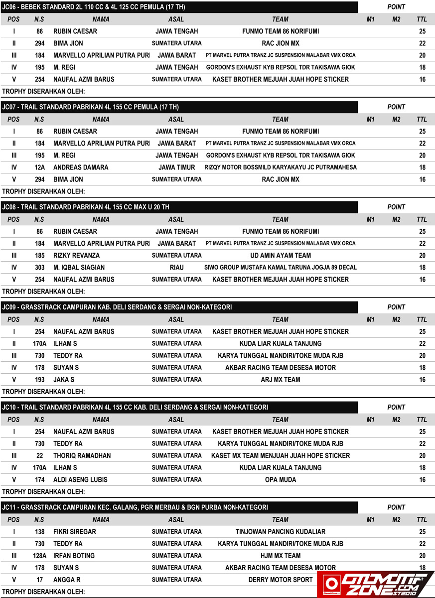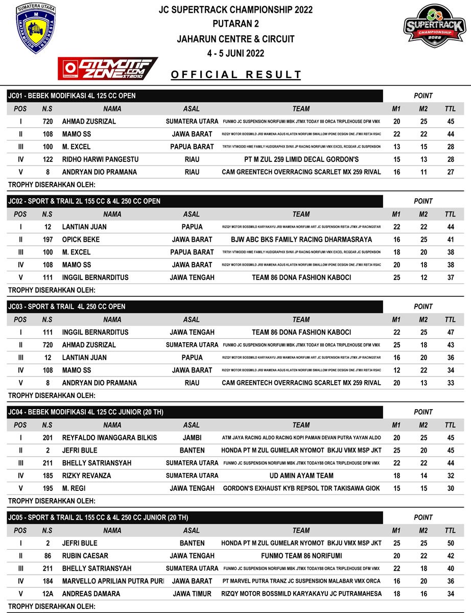 Racing Roda 2GrasstrackRace Results Hasil Lomba JC Supertrack Seri 2 2022 Deli Serdang Penulis Edi Batrawan - 5 Juni 2022 0 315 FacebookXPinterestWhatsApp OtomotifZone.com-Medan. Berikut hasil lomba JC Supertrack seri 2022 yang digelar Sabtu-Minggu, 4-5 Juni 2022 di Jaharun Circuit, Galang, Deli Serdang Sumatera Utara. Hasil lomba JC Supertrack seri 2 2022