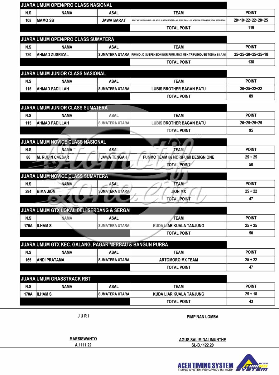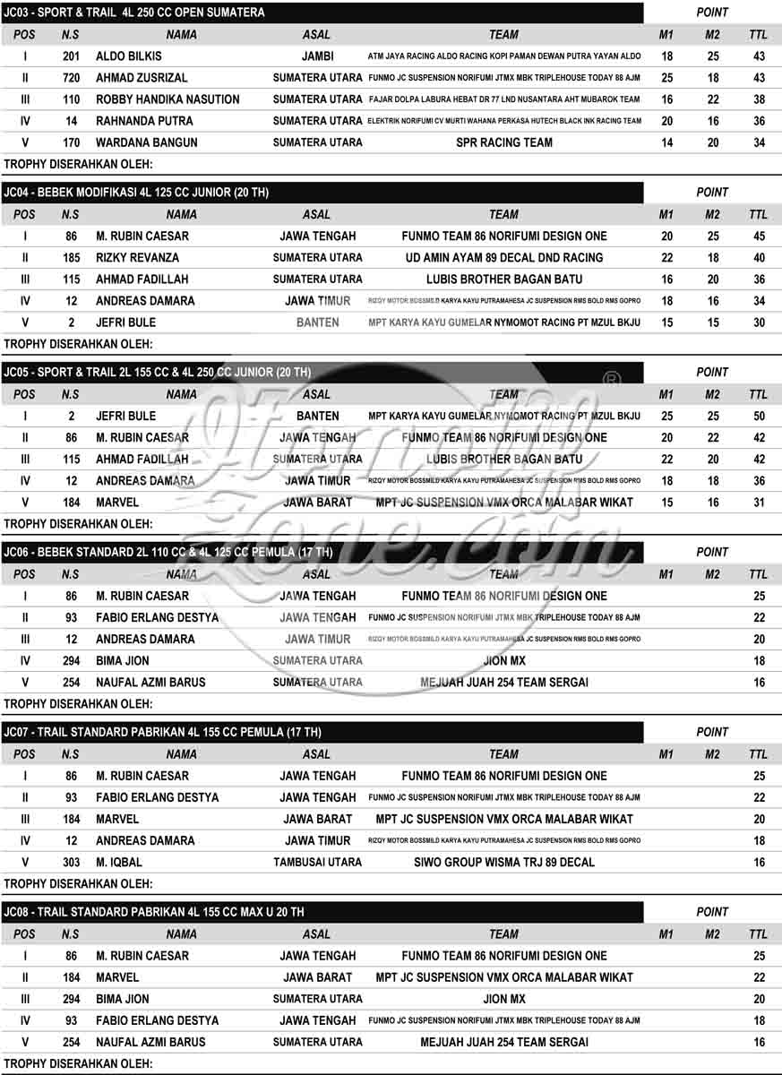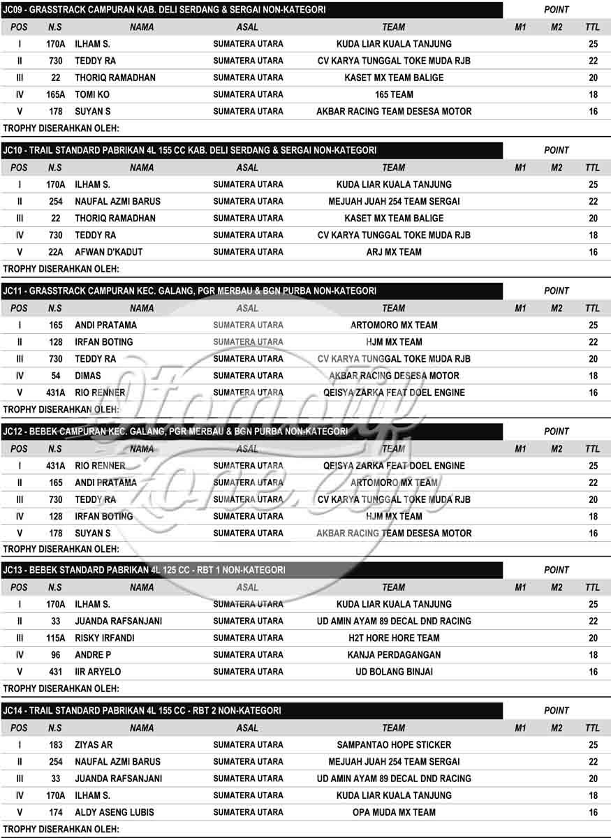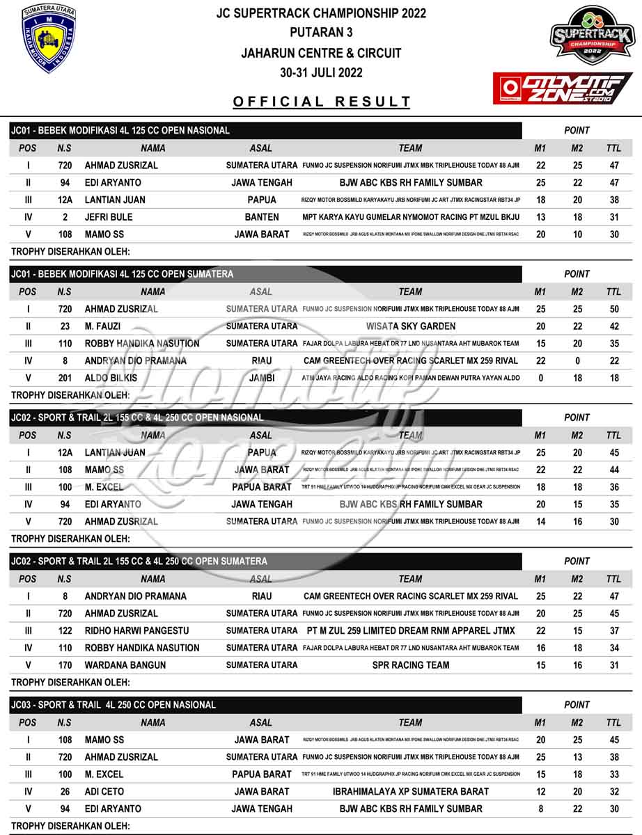 Racing Roda 2GrasstrackMotocrossRace Results Hasil Lomba JC Supertrack Seri 3 2022 Deli Serdang Penulis Edi Batrawan - 31 Juli 2022 0 383 FacebookXPinterestWhatsApp OtomotifZone.com-Medan. Putaran 3 JC Supertracl 2022 usai digelar Sabtu-Minggu, 30-31 Juli 2022 di Jaharun Circuit, Jaharun Centre, Galang, Deli Serdang Sumatera Utara. Berikut hasil lombanya : Hasil Lomba JC Supertrack putaran 3 2022