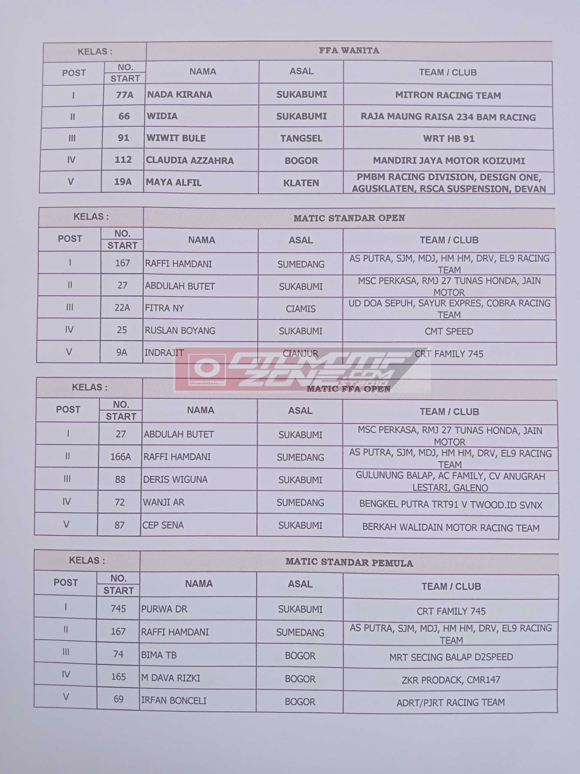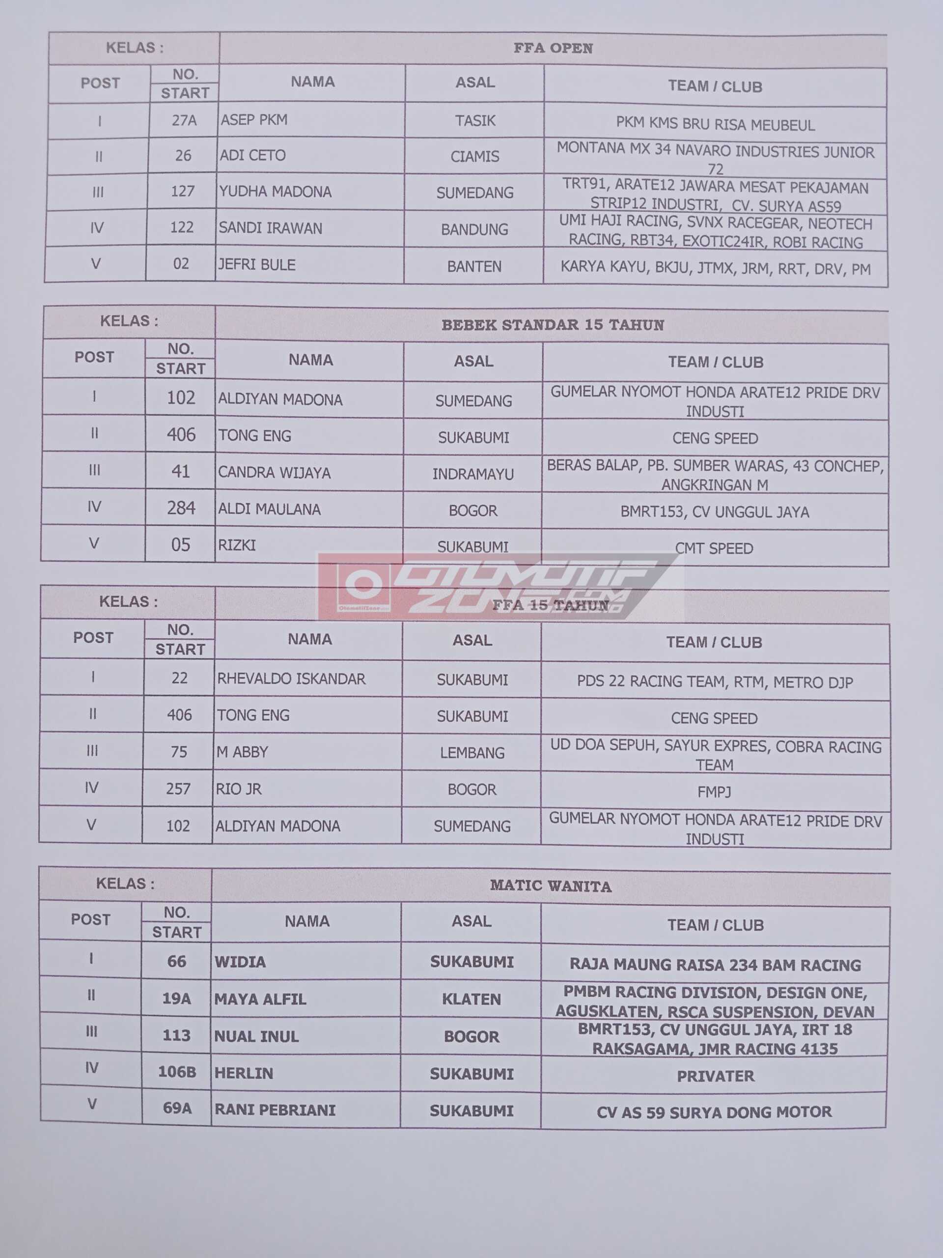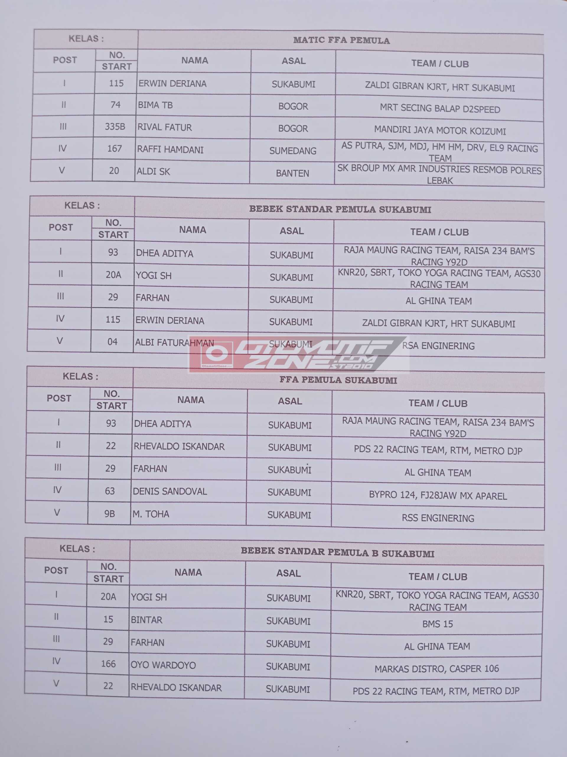 Masing-masing diantaranya ada Kelas 15 Tahun, Matik Pemula, Pemula Sukabumi, Pemula Jabar, Open, Matik Open dan kelas Wanita. Meski di ajang ini sempat di guyur hujan deras saat race berlangsung, namun tidak mengurangi persaingan sengit dari para pembalap.