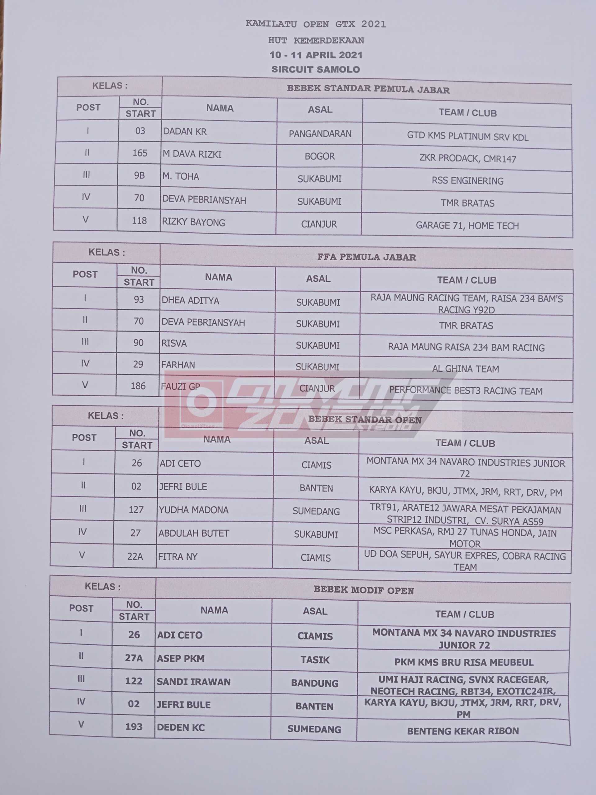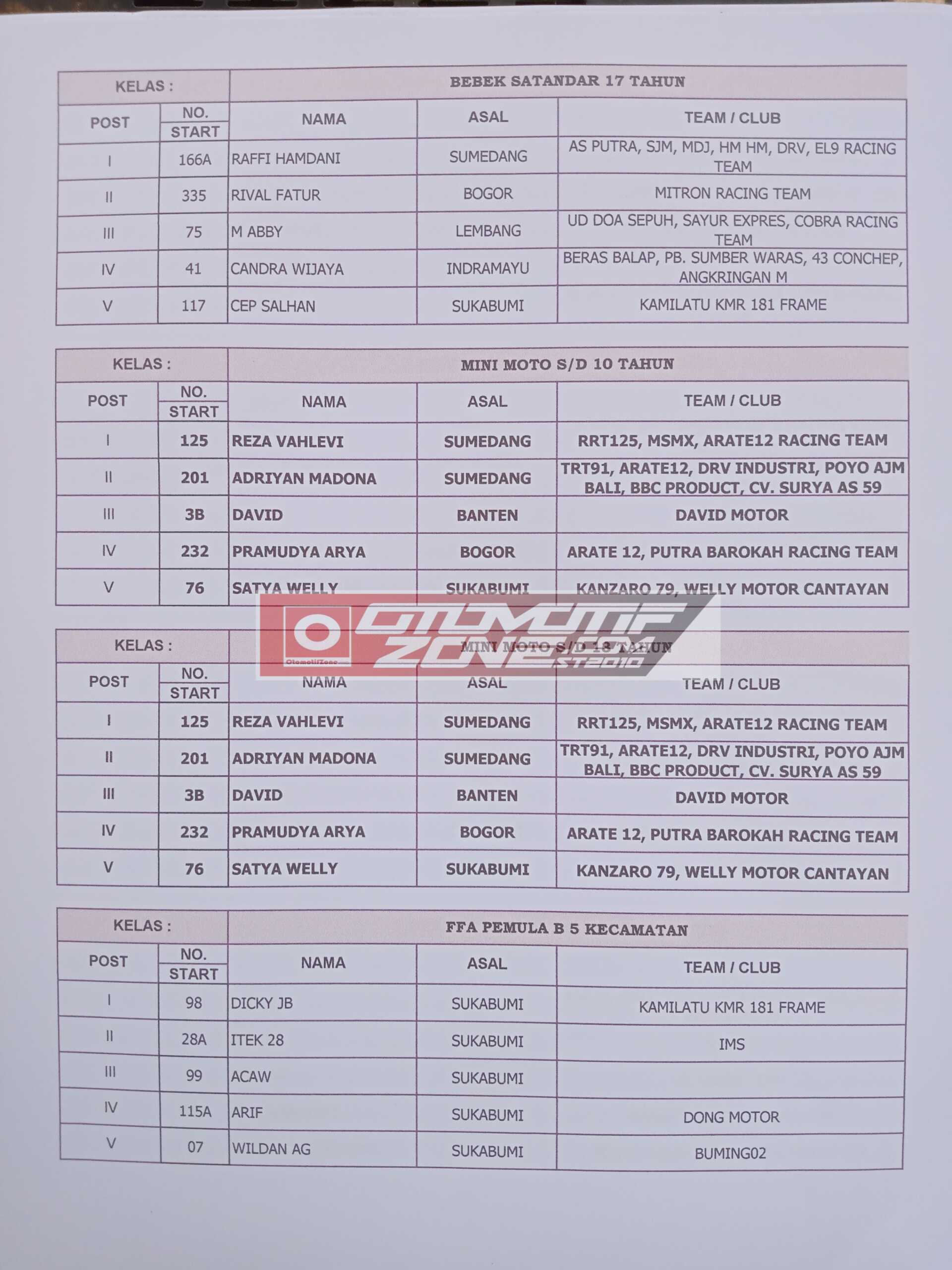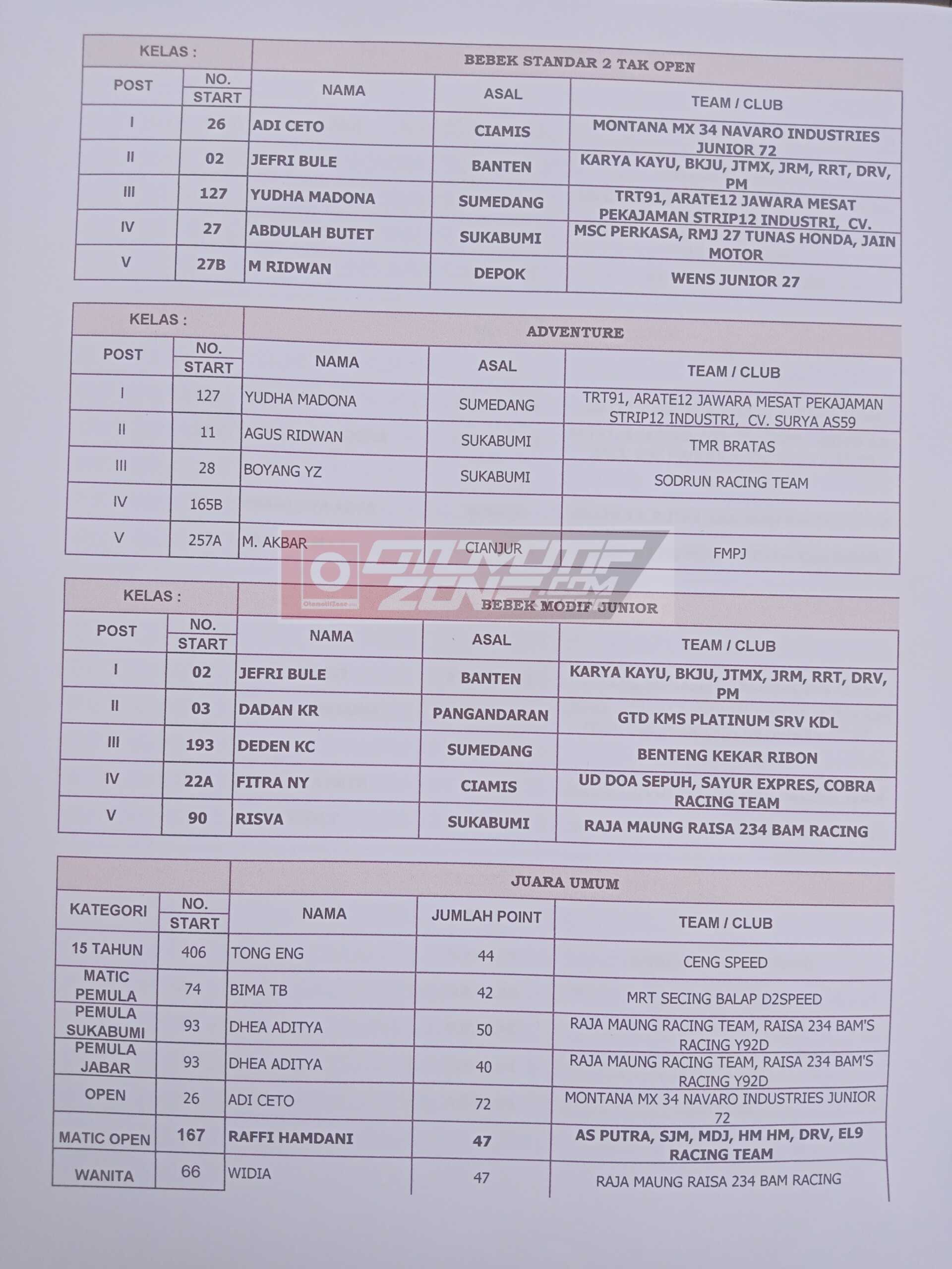 Masing-masing diantaranya ada Kelas 15 Tahun, Matik Pemula, Pemula Sukabumi, Pemula Jabar, Open, Matik Open dan kelas Wanita. Meski di ajang ini sempat di guyur hujan deras saat race berlangsung, namun tidak mengurangi persaingan sengit dari para pembalap.