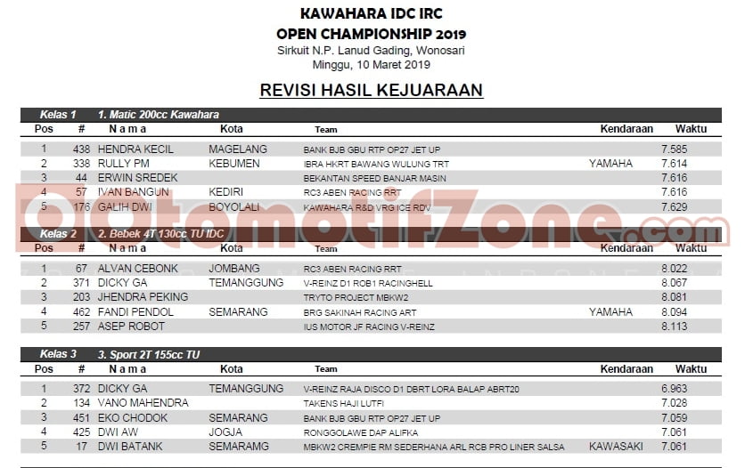 OtomotifZone.com – Wonosari. Sungguh sangat disayangkan bila kalian tidak mengikuti Kawahara IRC IDC 2019 putaran 1 (10/3) di Sirkuit NP Lanud Gading Wonosari, Gunung Kidul, Yogyakarta. Tidak akan ada habisnya bila kita membicarakan event ini. Pasalnya persaingan di setiap kelasnya sangat sengit. Para tim dan pembalap saling adu gengsi untuk menjadi yang terbaik.