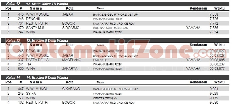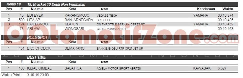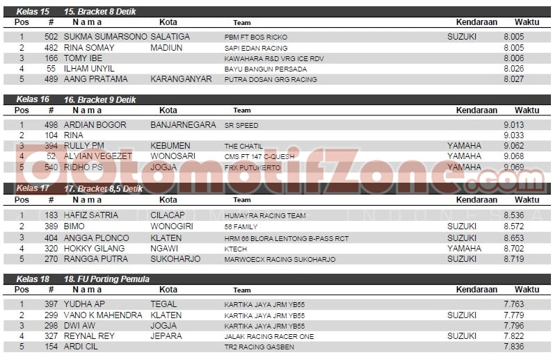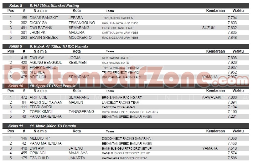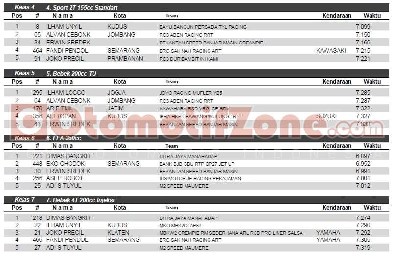 Pada putaran 1 ini banyak sekali kejadian menarik. Raihan waktu sangat rapat disetiap kelasnya. Meski di guyur hujan namun aroma panas persaingan masih tetap terasa. Dan pada putaran 1 ini, catatan rekor nasional tercatat. Agar lebih jelas, berikut hasil lomba disetiap kelasnya:
