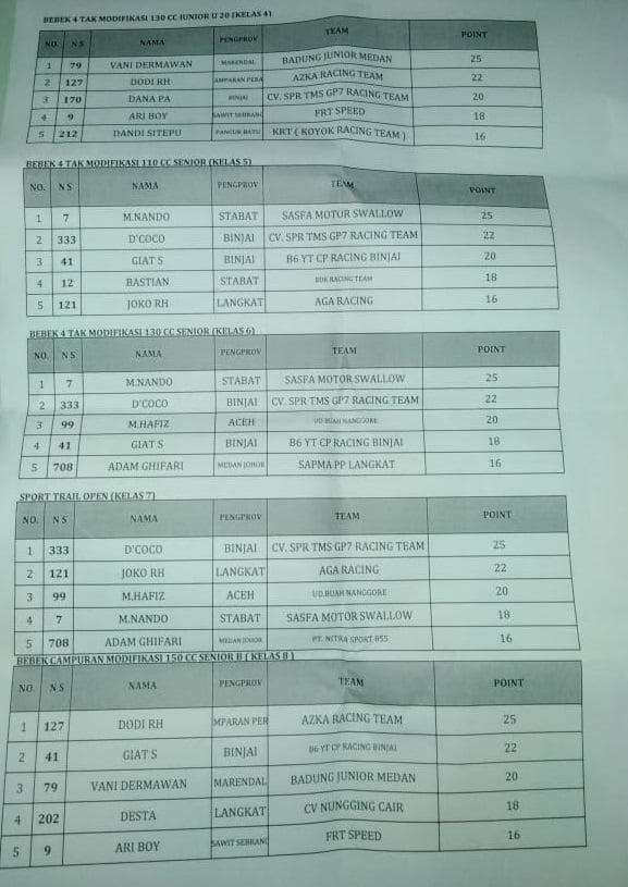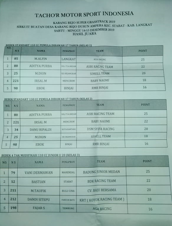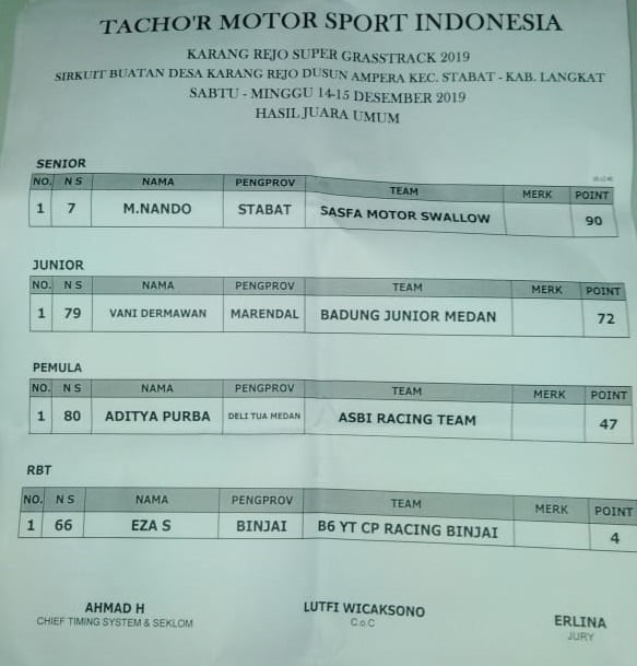 Otomotifzone.com – Langkat. Berikut ini adalah hasil lomba Karang Rejo Super Grasstrack 2019 yang telah usai di helat pada Minggu 15/12/2019, Di sirkuit buatan Desa Karang rejo, Dusun Ampera, Kecamatan Stabat, Kabupaten Langkat, Sumatera Utara.