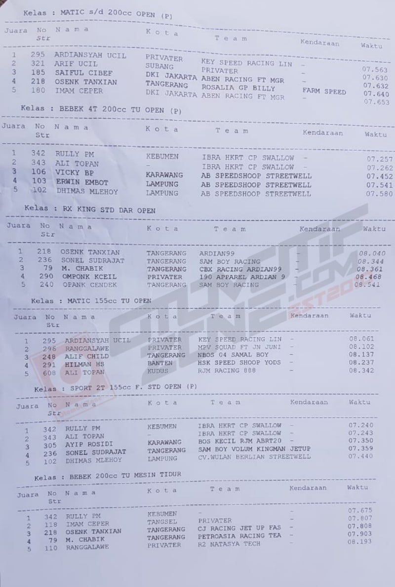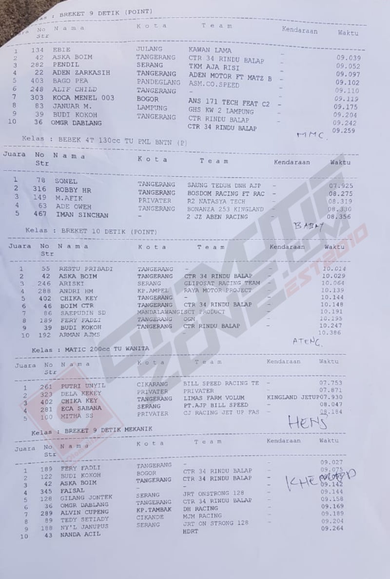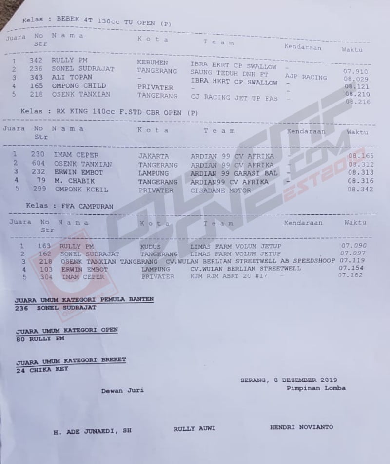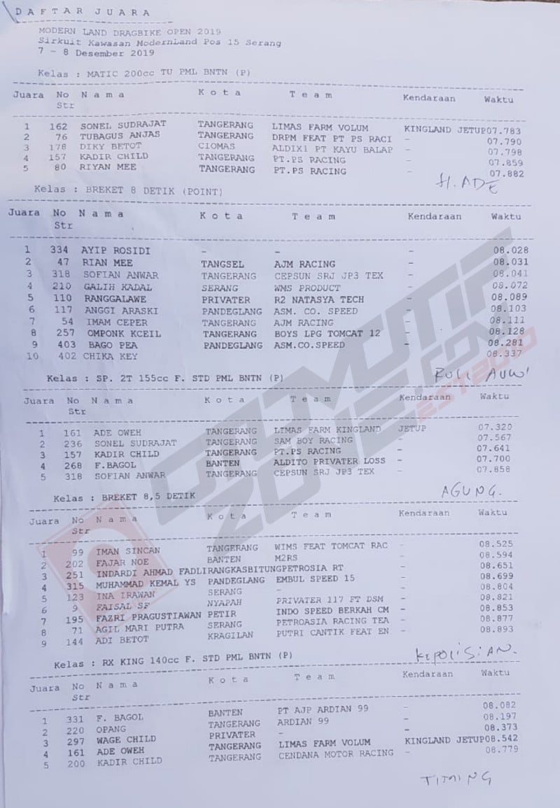 OtomotifZone.com – Banten. Berikut ini adalah hasil lomba kejuaraan Modernland Drag Bike Open 2019 di kawasan Moderen Pos 15 Cilayon-Cikande, Serang, Sabtu – Minggu (7-8/12).