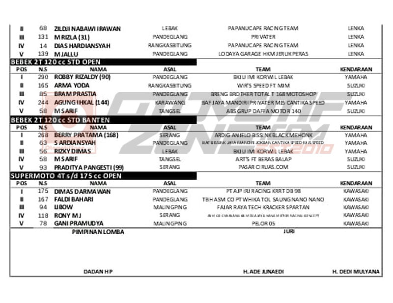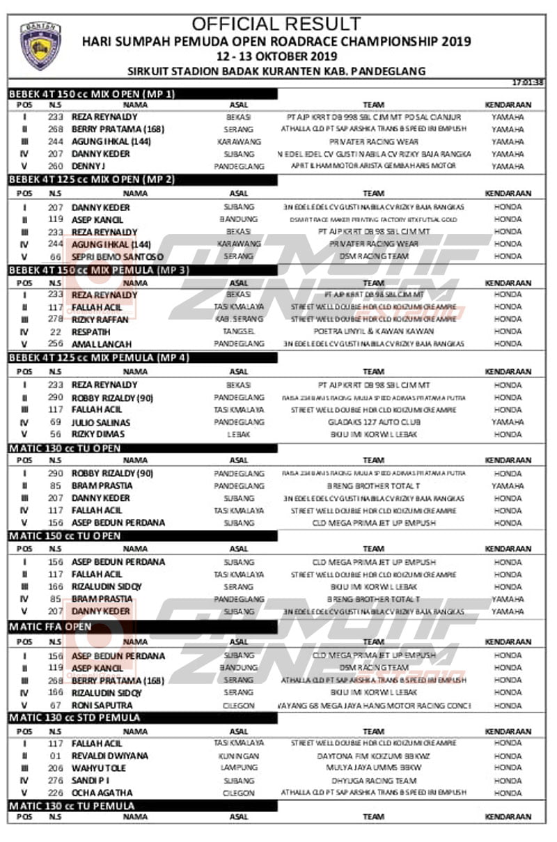 OtomotifZone.com – Banten. Berikut ini adalah Hasil Lomba Kejuaraan Piala Bupati Road Race Pandeglang 2019 yang berlangsung di sirkuit Stadion Badak Kuranten, Pandeglang, Minggu (13/10).