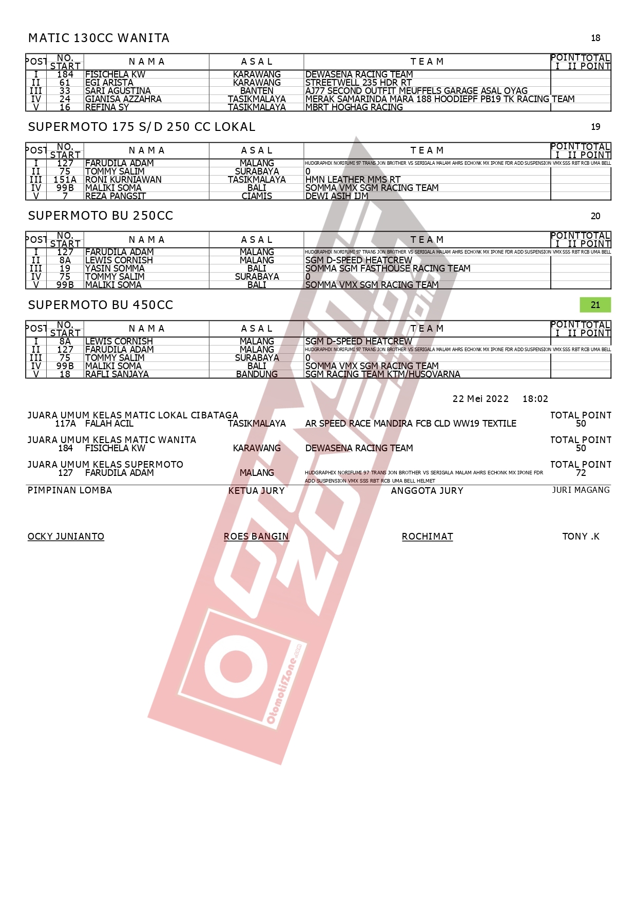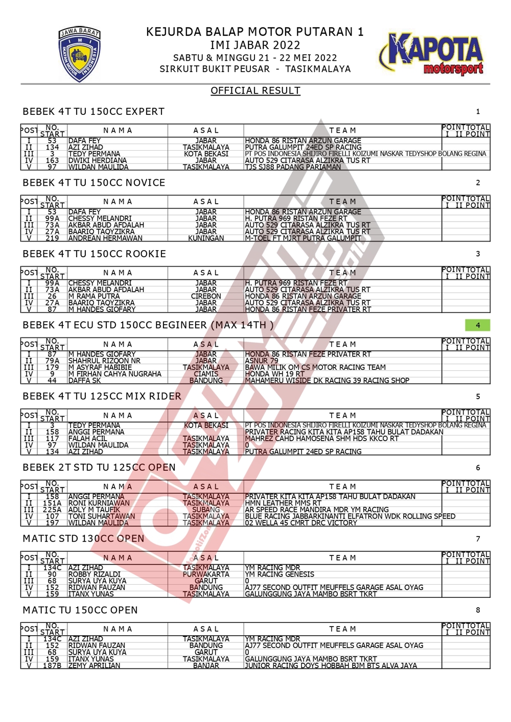 OtomotifZone.com – Tasikmalaya. Usai sudah gelaran Kejuaraan Daerah IMI Jawa Barat yang berlangsung (21-22/5/22) di Sirkuit Bukit Peusar Tasikmalaya, Jawa Barat. Pada Kejuaraan ini pebalap pebalap asal Jawa Barat ikut memanaskan persaingan demi menjadi yang terbaik. Pebalap terbaik keluar sebagai jauranya. Berikut hasil lombanya:[ Foto : Irsan]