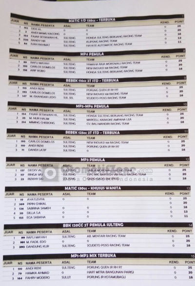 Otomotifzone.com – Sulteng. Berikut ini adalah hasil Lomba Kejurda Balap Motor IMI Sulteng 2018 Seri 1 Piala Bupati Parigi Moutong yang berlangsung di sirkuit Alun – alun Kantor Bupati Moutong, Sulawesi Tengah, Minggu (4/2). :