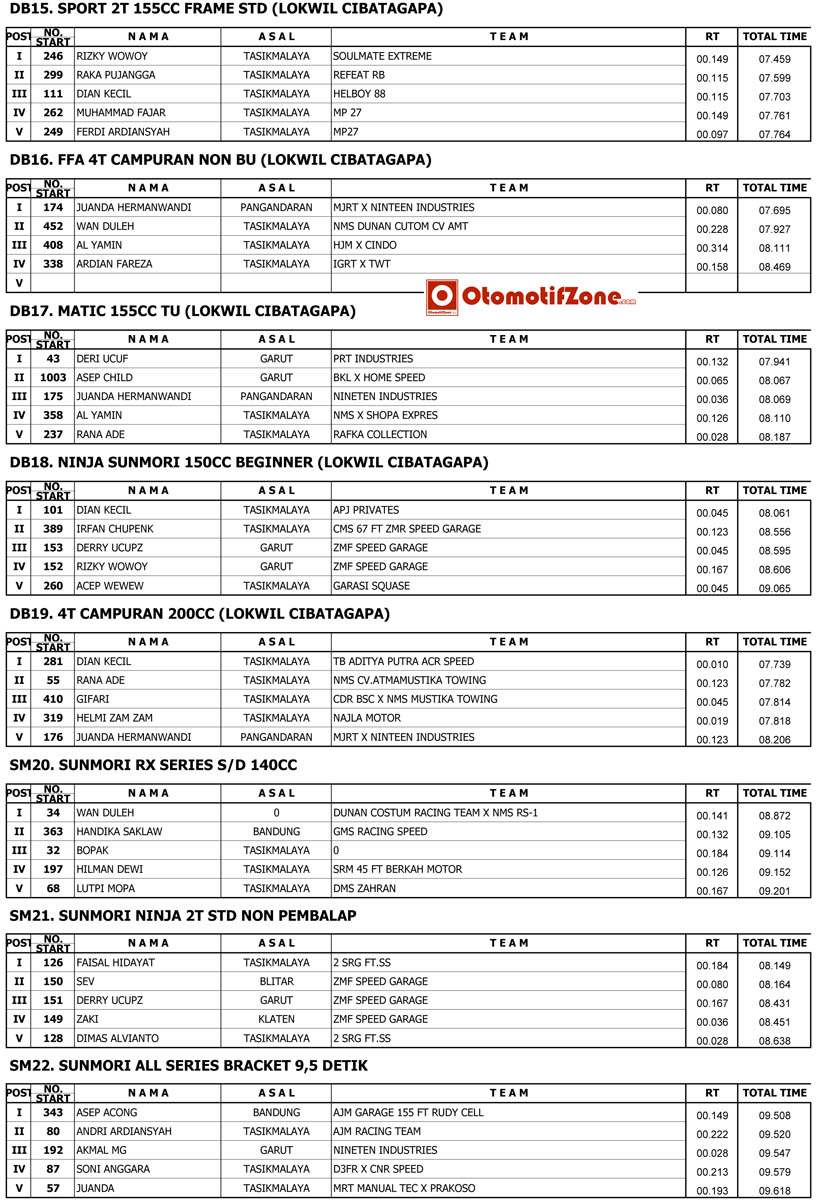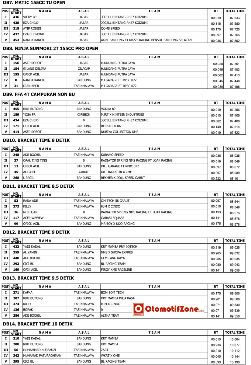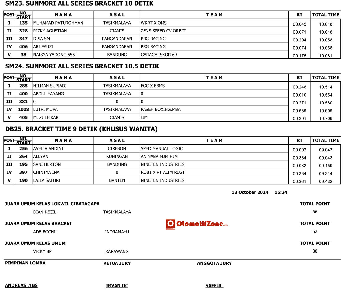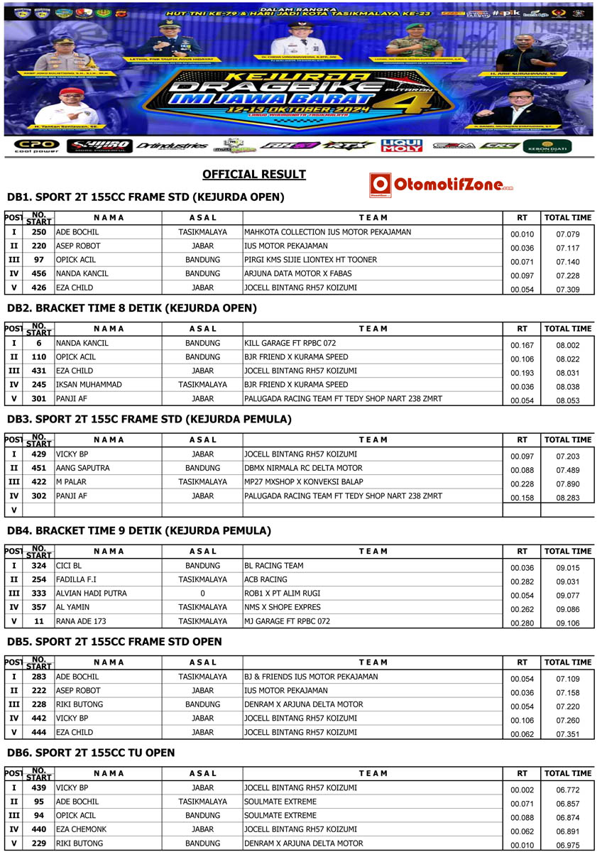 OtomotifZone.com-Tasikmalaya. Berikut hasil lomba kejuaraan daerah drag bike IMI Jabar putaran 4 2024 yang sudah digelar Sabtu-Minggu, 12-13 Oktober 2024 di sirkuit lintasan pesawat Lanud TNI AU Wiriadinata kota Tasikmalaya.