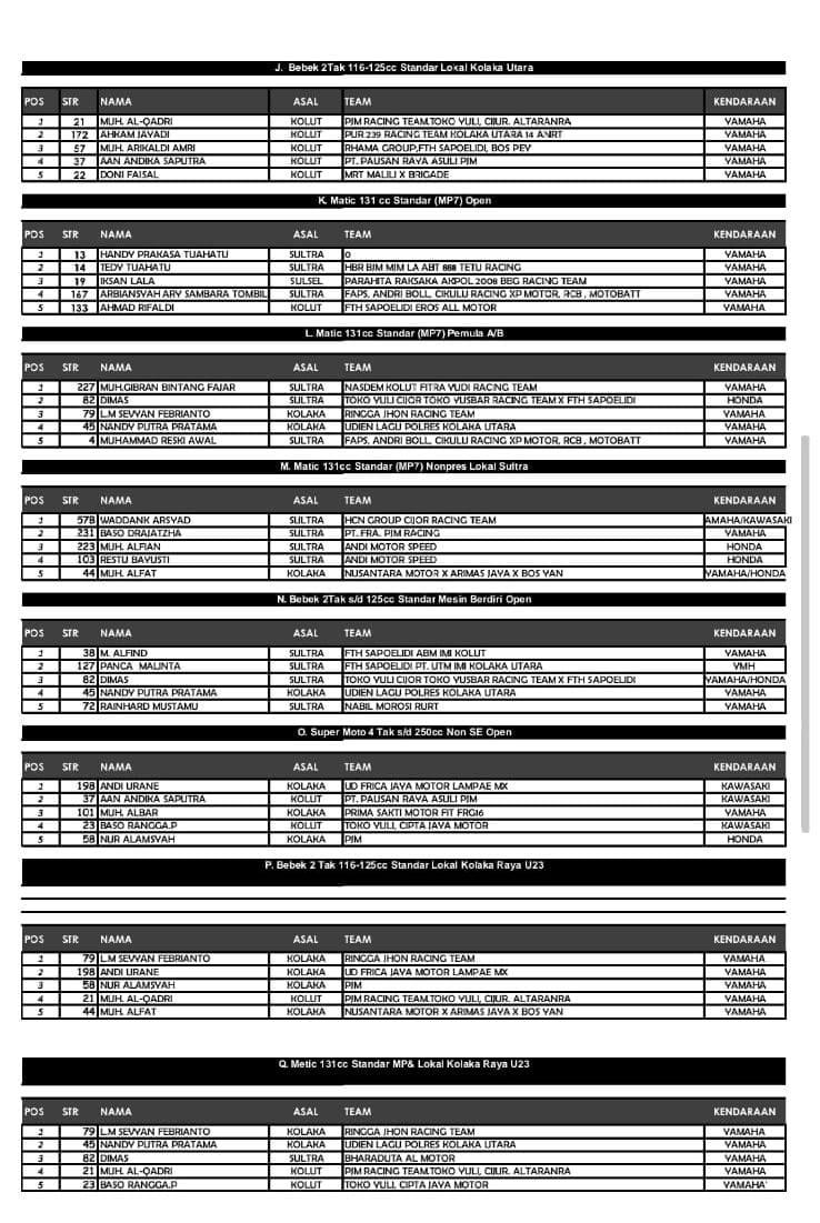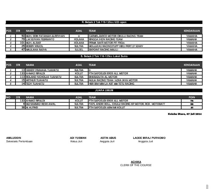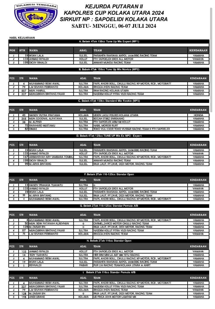 OtomotifZone.com – KOLUT. Usai sudah gelaran Kejurda Seri II merebutkan piala Kapolres Cup 2024 yang berlangsung (7/7/24) di Sirkuit NP Sapoelidi, Kolaka Utara. Balapan berjalan seru. Persaingan panas terjadi disetiap kelas yang dilombakan. Pebalap pebalap Nasional Kejurnas Motoprix Region D juga ikut memanaskan persaingan. Pebalap tuan rumah juga ikut ambil andil bagian untuk menjadi yang terbaik. Pebalap terbaik keluar sebagai juaranya. Berikut hasil lombanya: