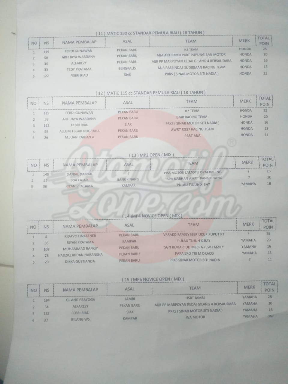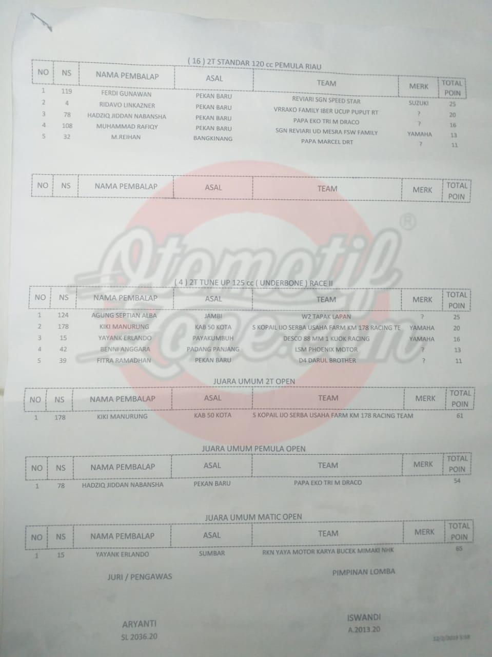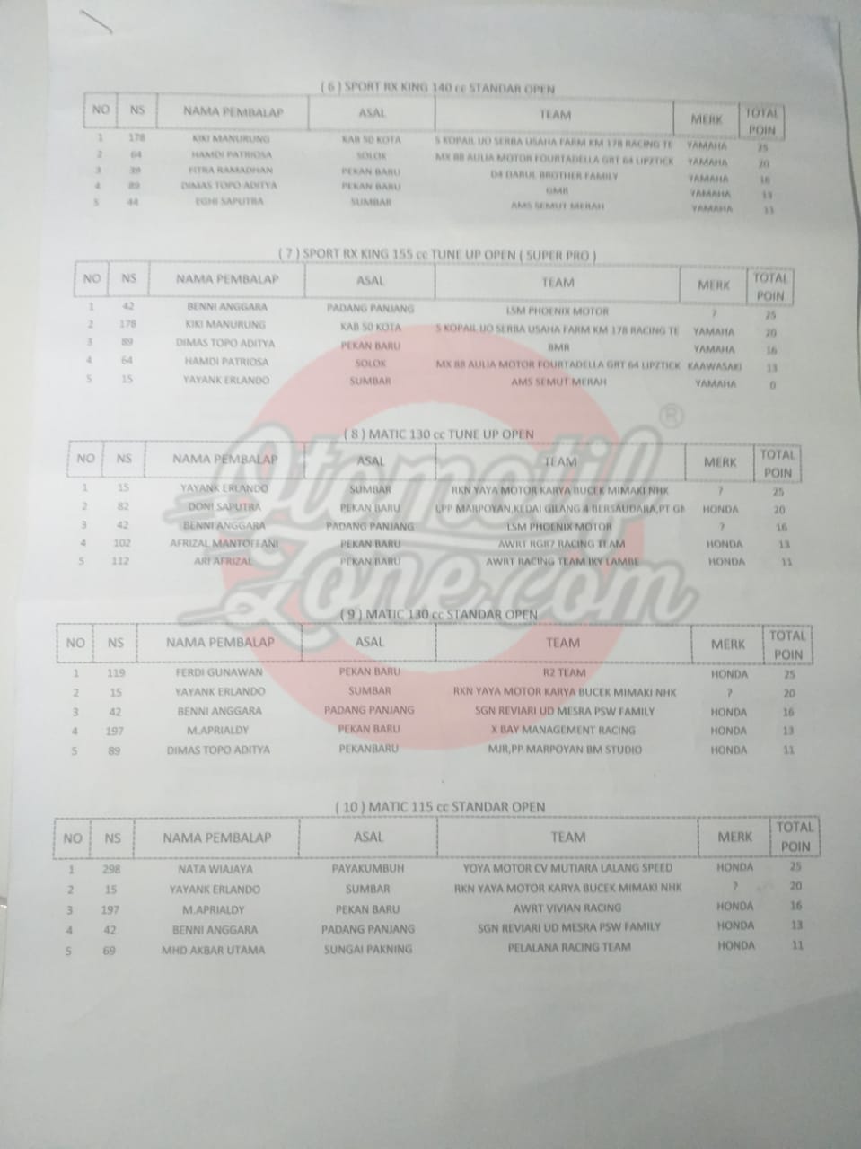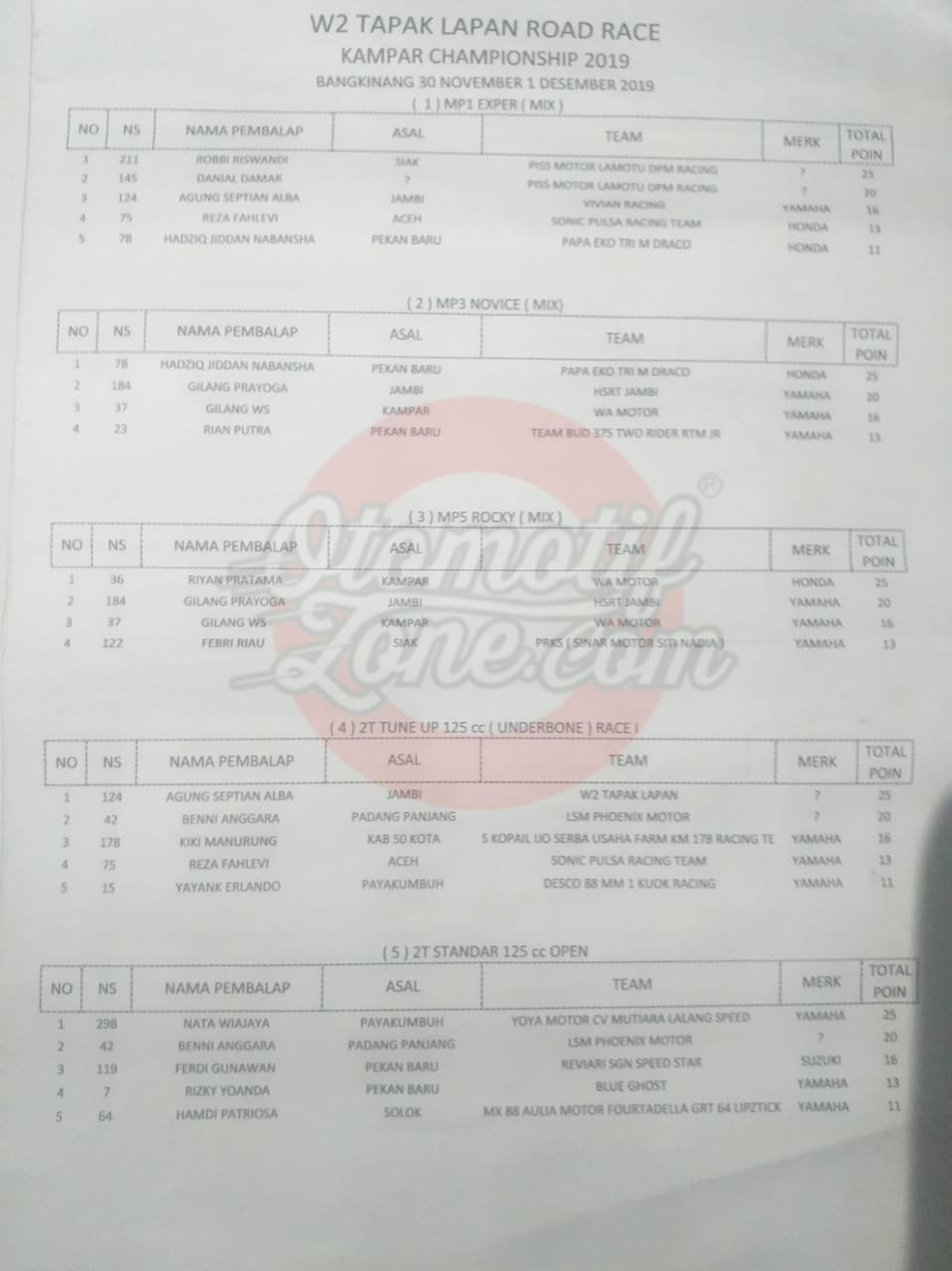 Otomotifzone.com – Riau. Berikut ini adalah hasil lomba Kejurda W2 Tapak Lapan Road Race Kampar Championship 2019 Bangkinang yang digelar di sirkuit Permanen Sport Center Bangkinang,Riau (01/12/19)