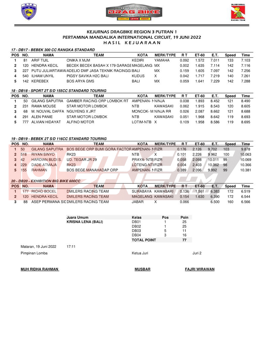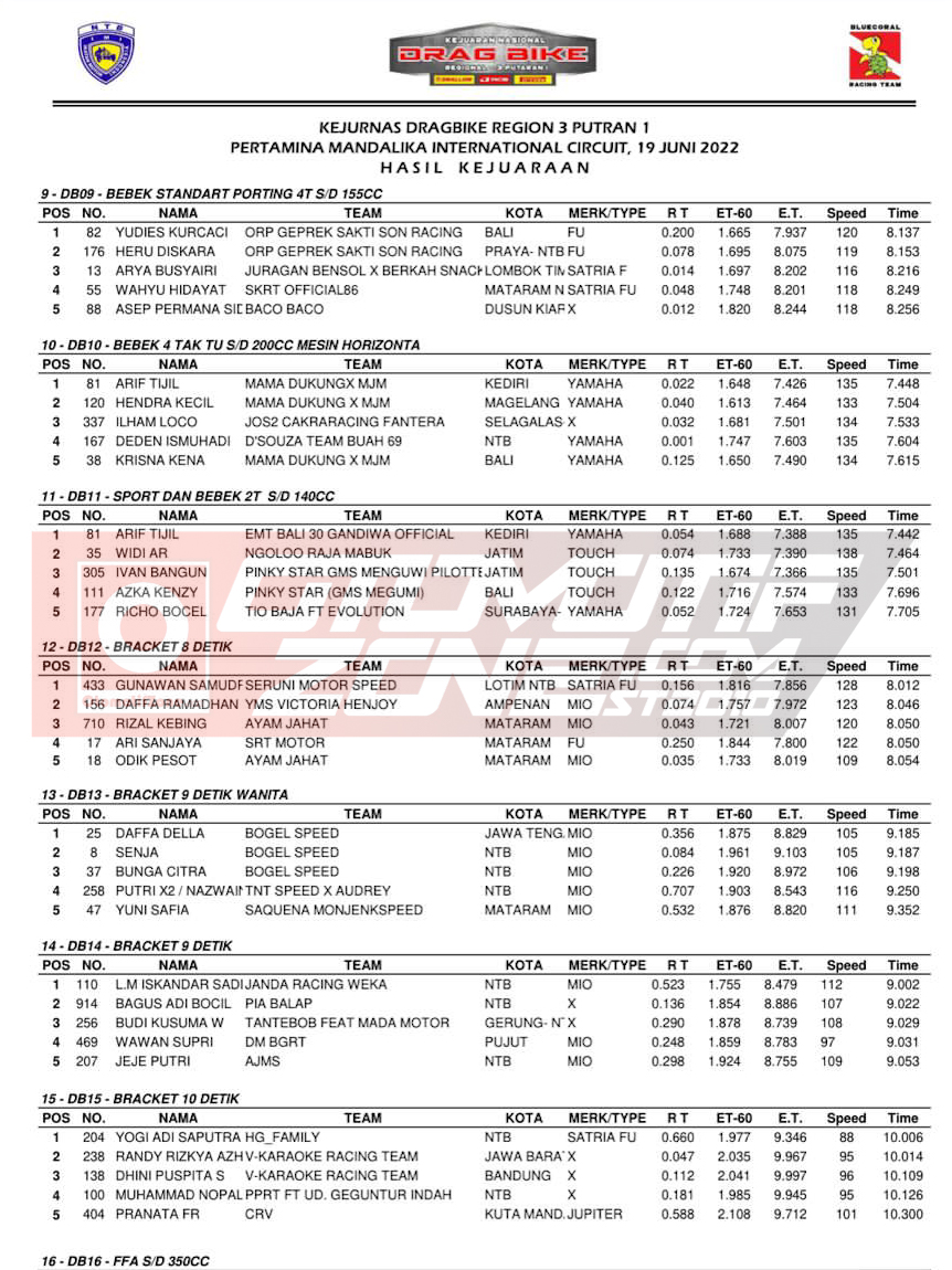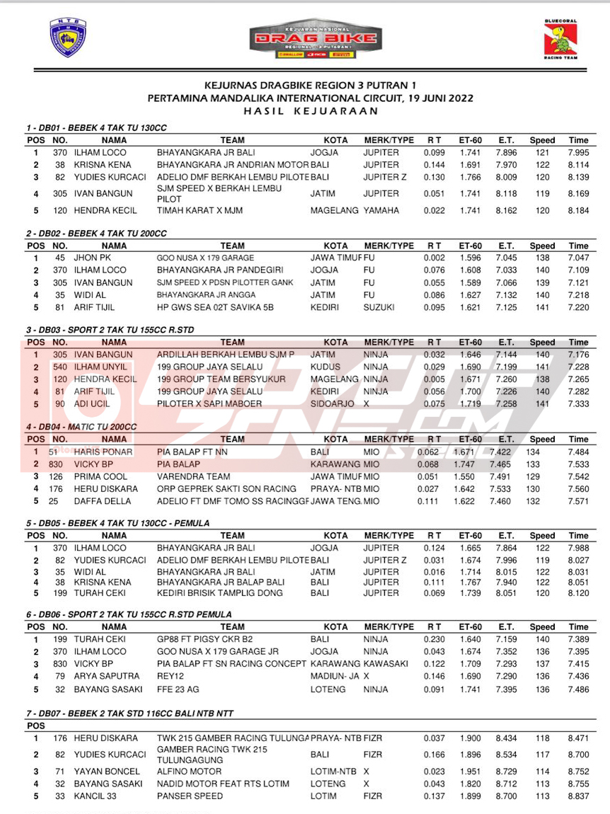 OtomotifZone.com – Lombok. Usai sudah gelaran Kejurnas Drag Bike Regional 3 Putaran 1 yang di adakan di Sirkuit Internasional Street Mandalika, Lombok. Salah satu event balap drag motor yang di adakan di Sirkuit Mandalika ini berhasil menjadi sorotan karena menjadi salah satu event Drag Bike terbesar di Lombok. Banyak Pembalap dari Bali, NTT, NTB dan Jawa yang datang di balapan ini. Berikut daftar juaranya.