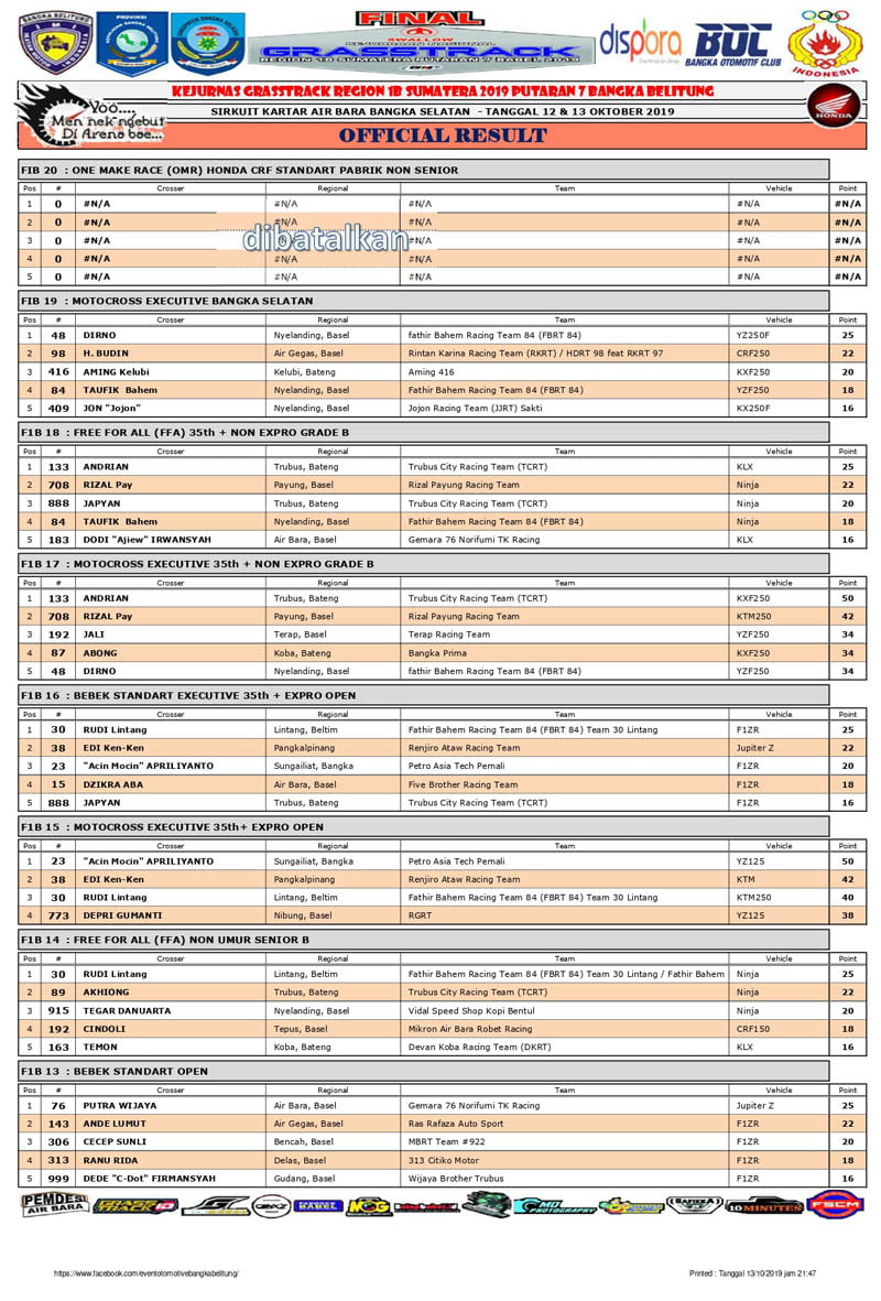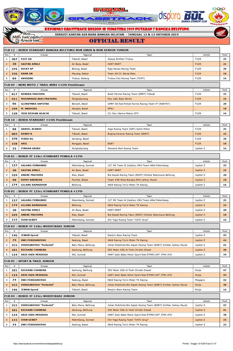 OtomotifZone.com – Jakarta. Berikut ini adlaah Hasil Lomba Kejurnas Grasstrack 2019 Region 1B Sumatera Seri 7 Bangka Belitung yang berlangsung di sirkuit Kartar Air Bara, Bangka Selatan, Minggu (13/10).