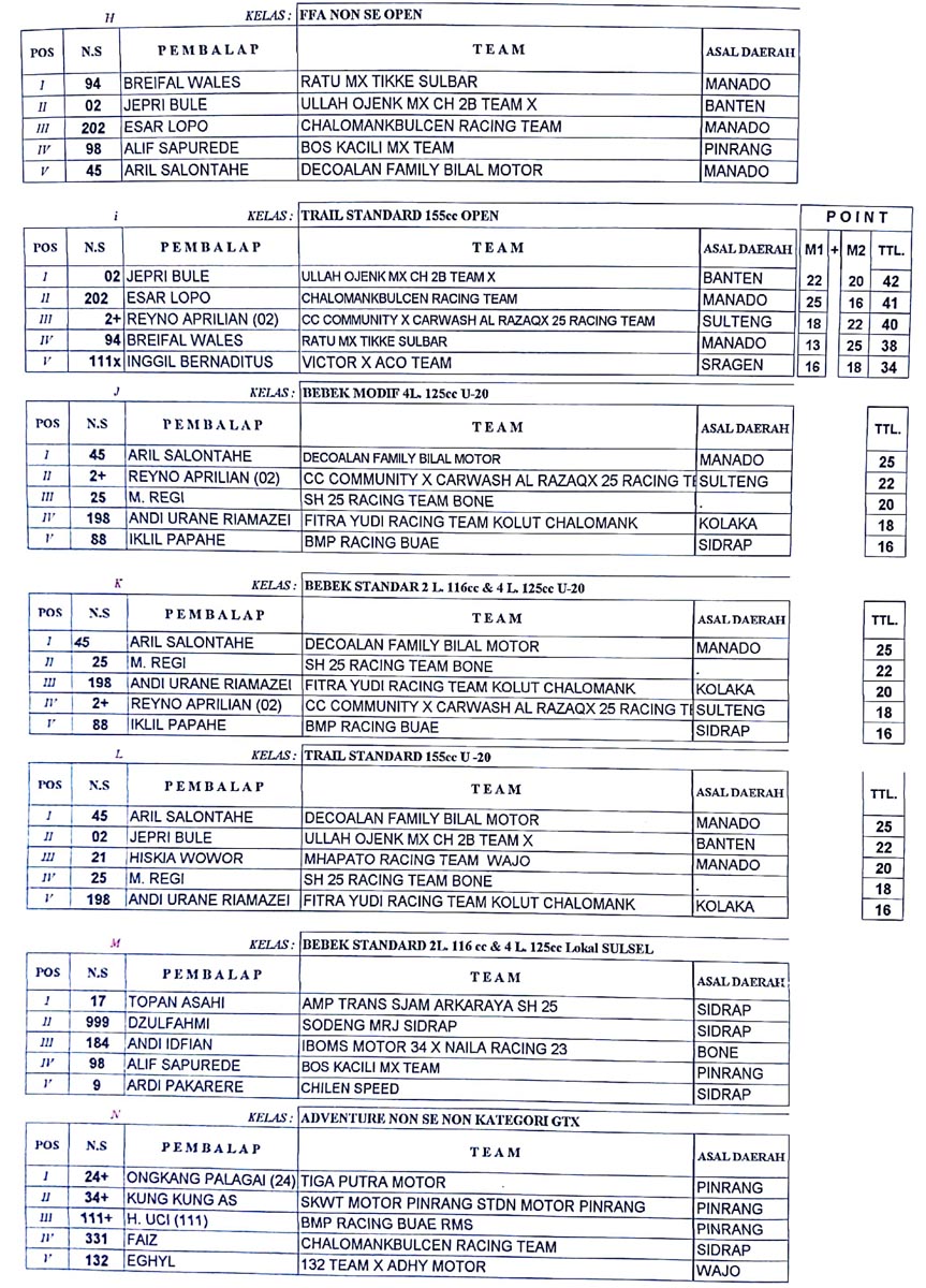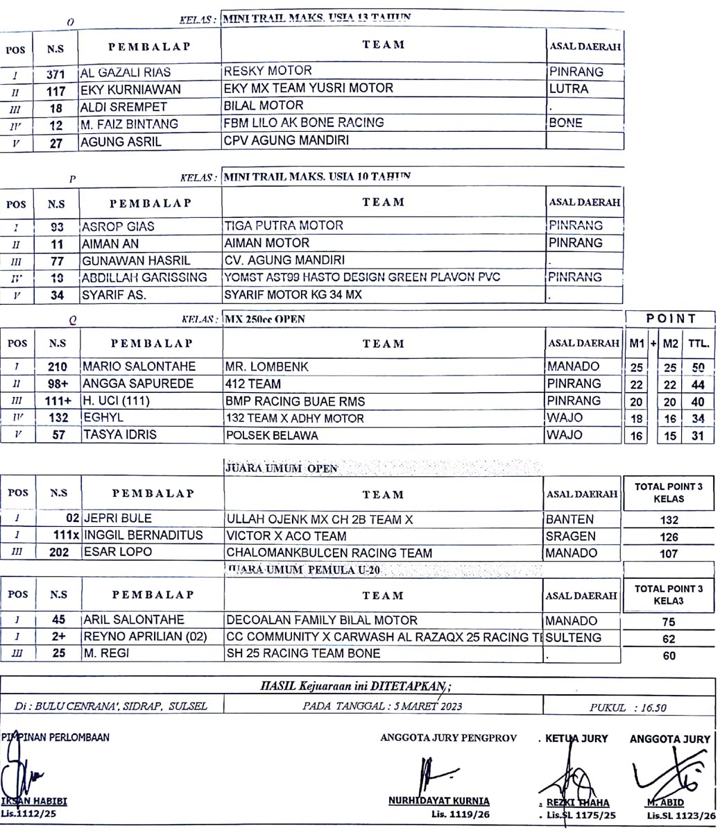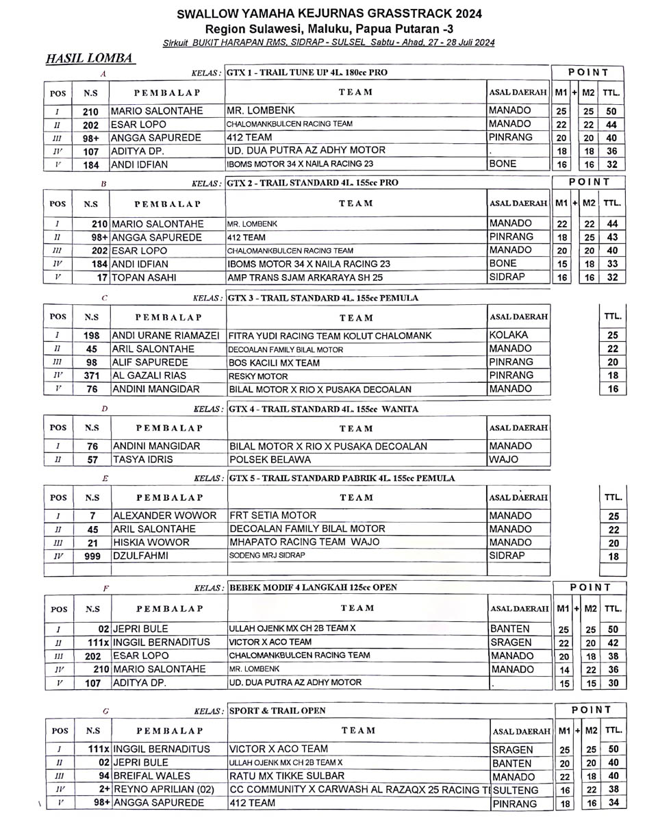 OtomotifZone.com-Sidrap. Berikut hasil lomba Swallow Yamaha Kejurnas Grasstrack 2024 putaran 3 yang digelar Sabtu-Minggu, 27-28 Juli 2024 di sirkuit Bukit Harapan RMS Sidrap Sulawesi Selatan.