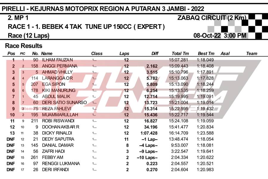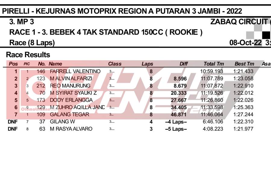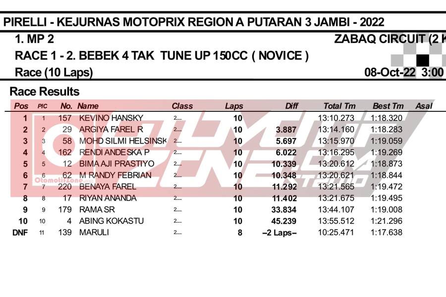 OtomotifZone.com – Jambi. Usai sudah gelaran hari pertama Kejurnas Motoprix Region A putaran 3 yang berlangsung (8-9/10/22) di Zabaq Internasional Circuit, Jambi. Pada gelaran ini, tim tim Kejurnas datang dengan formasi komplit. Yang mana membuat persaingan juga sangat panas karena perolehan point masih rapat. Hari pertama dilaksanakan untuk Race 1. Berikut hasil juara race 1 di kelas Kejurnas: