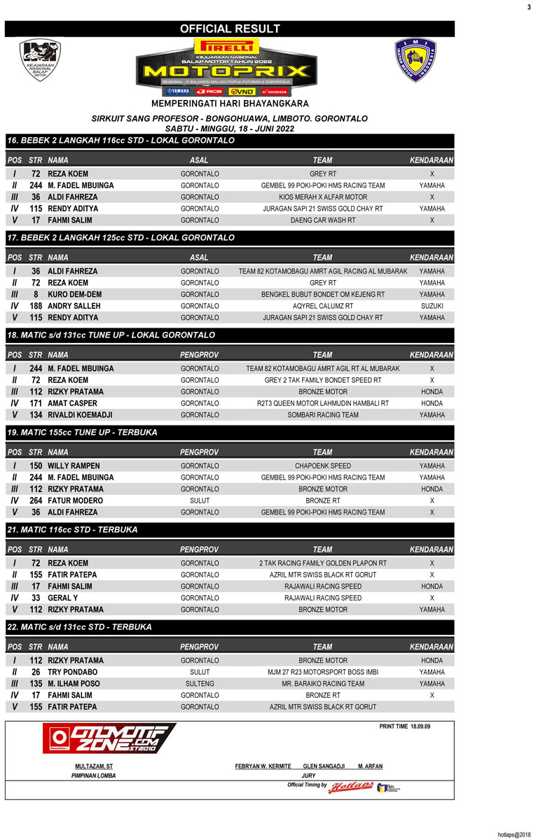 OtomotifZone.com-Gorontalo. Berikut hasil lomba kejurnas MotoPrix region D putaran 2 2022 baik kelas wajib kejurnas dan supporting class yang digelar Sabtu-Minggu, 18-19 Juni 2022 di sirkuit permanen Sang Profesor Bongohulawa, Limboto Kabupaten Gorontalo.