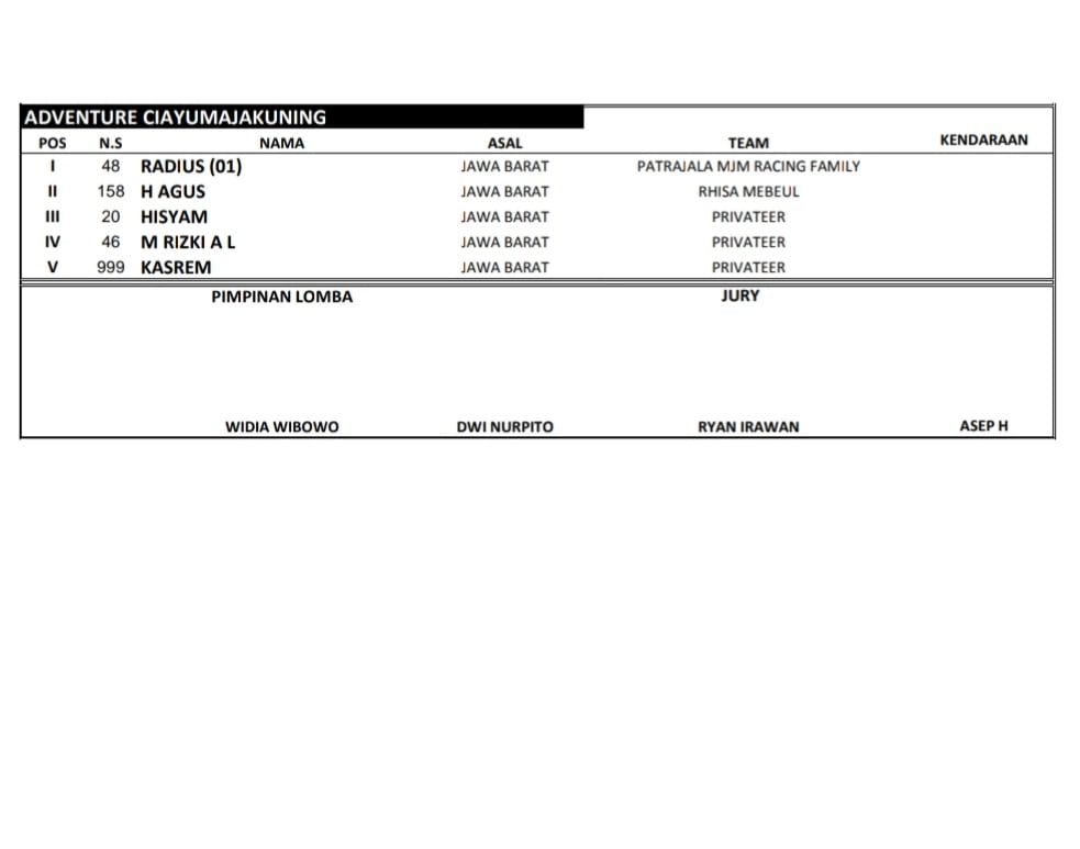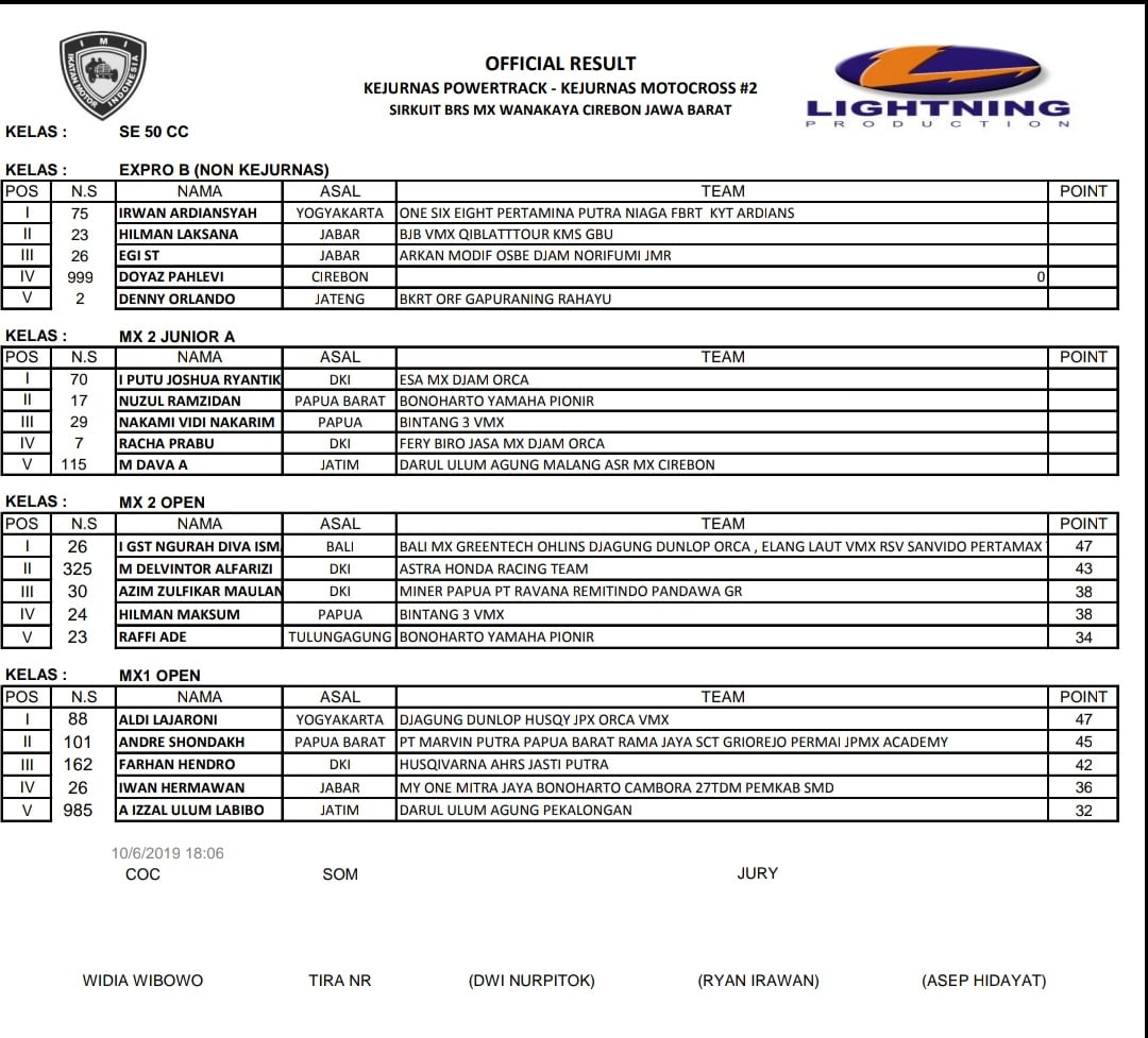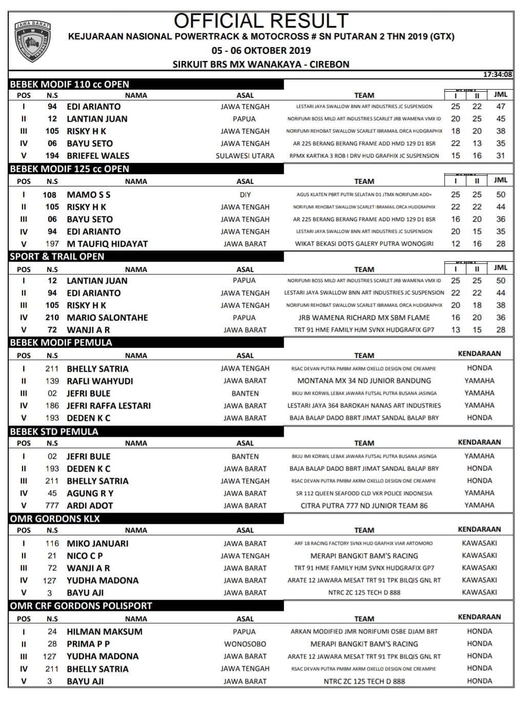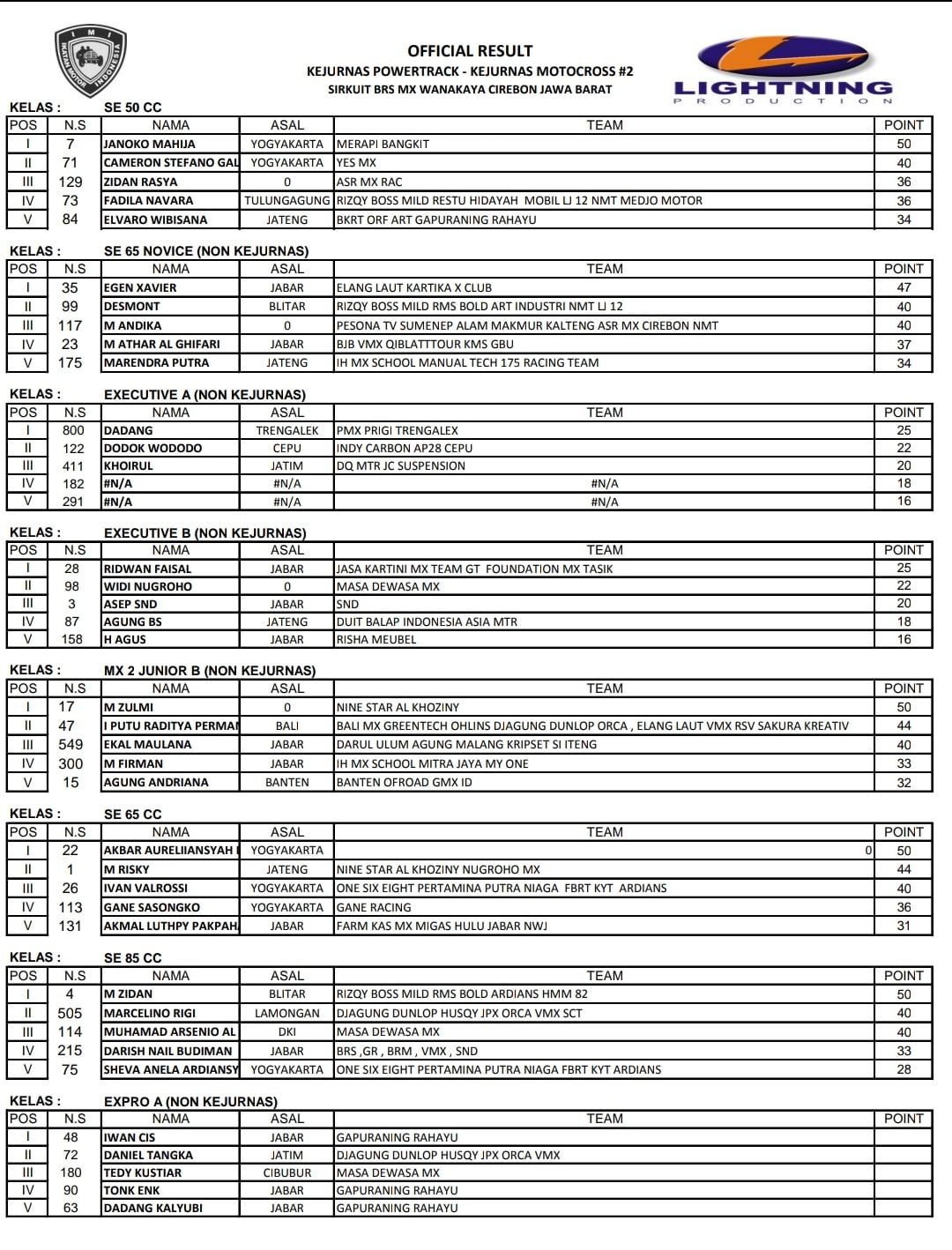 OtomotifZone.com – Cirebon. Berikut ini adalah hasil lomba Kejurnas Powertrack 2019 seri 2 Cirenon yang berlangsung di sirkuit BRS MX Wanakaya, Cirebon, Jawa Barat, Minggu (6/10).
