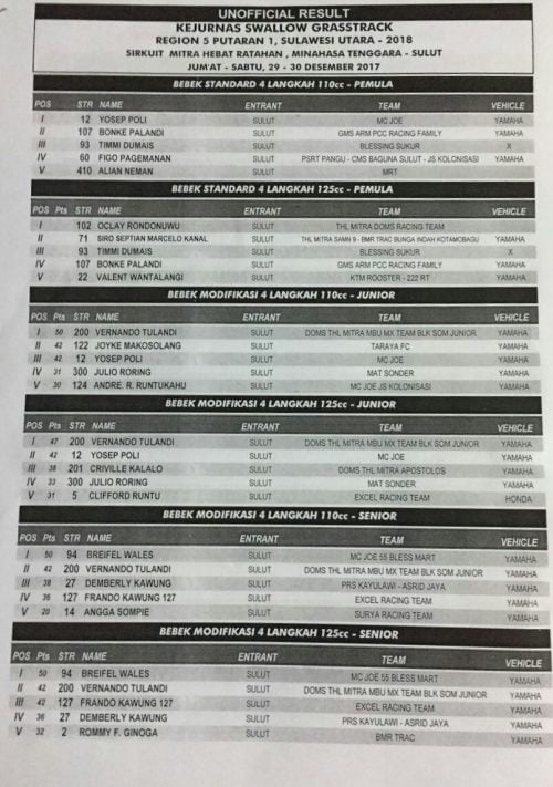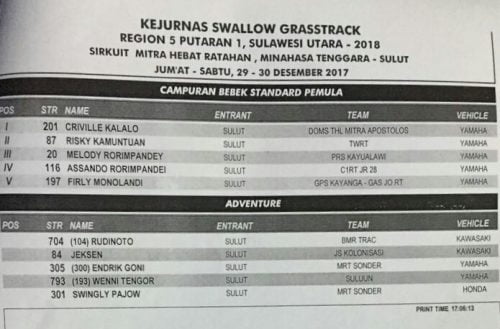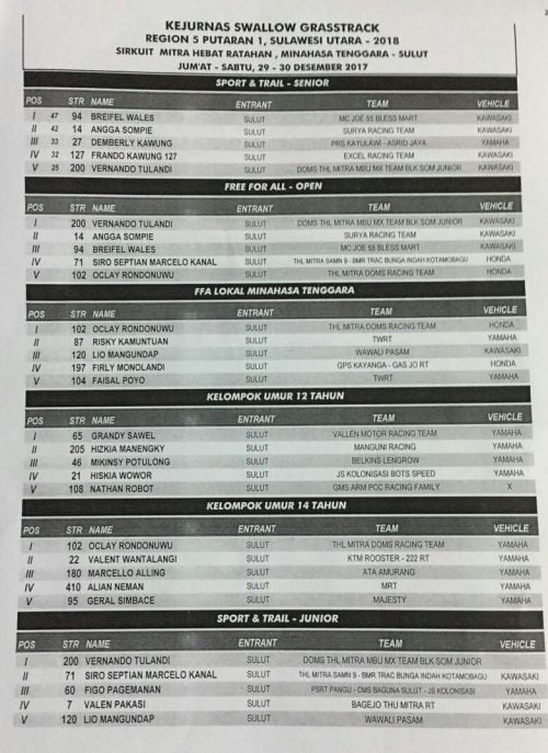 Race Results Hasil Lomba Kejurnas Swallow Grasstrack 2018 Region 5 Seri 1 Sulawesi Utara Penulis OtomotifZone.com - 9 April 2018 0 371 FacebookXPinterestWhatsApp Otomotifzone.com – Sulawesi Utara. Berikut ini adalah hasil lomba Kejurnas Swallow Grasstrack 2018 Region 5 Seri 1 Sulawesi Utara yang berlangsung di sirkuit Mitra Hebat Ratahan Minahasa Tenggara, Sulawesi Utara, Minggu (8/4)