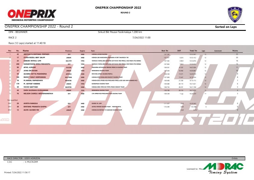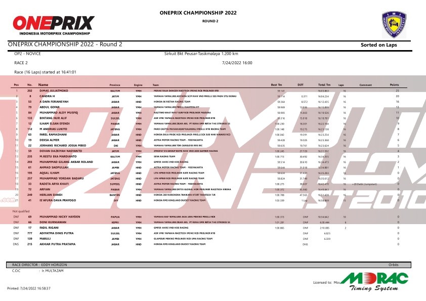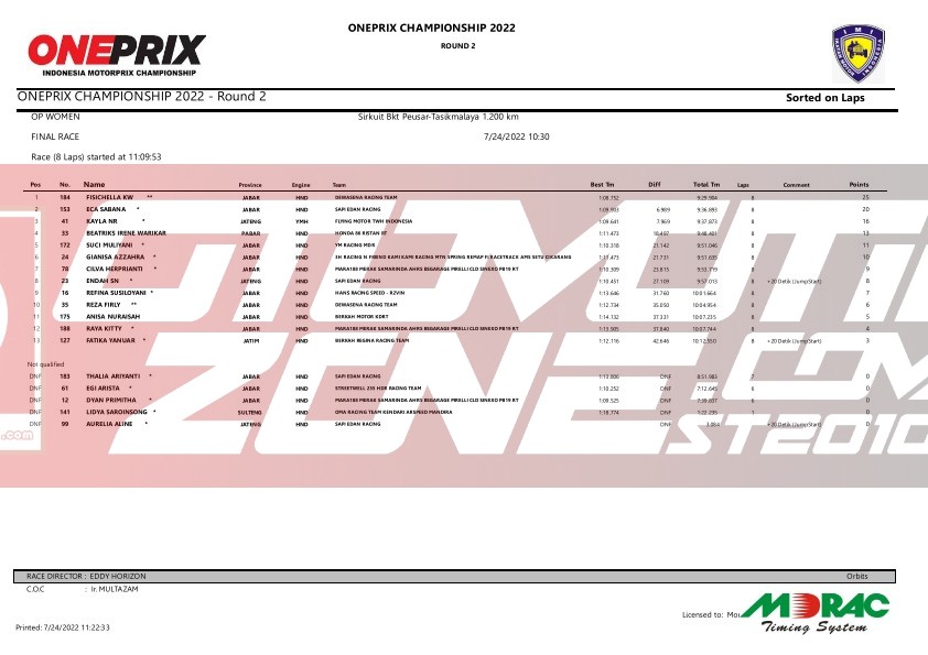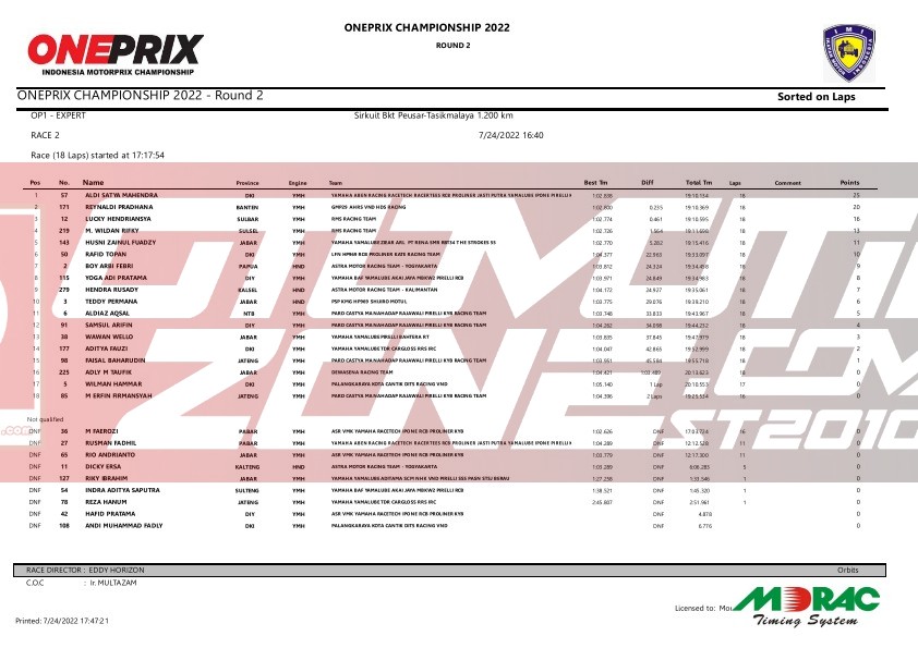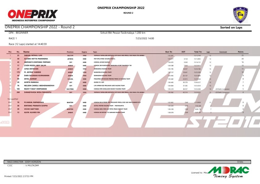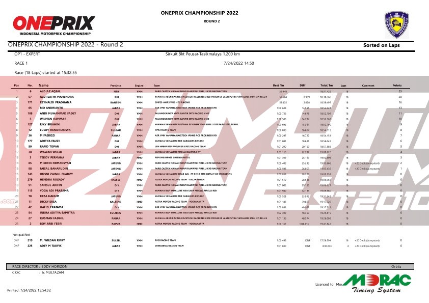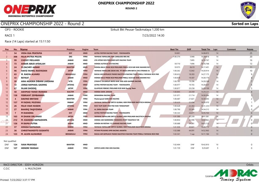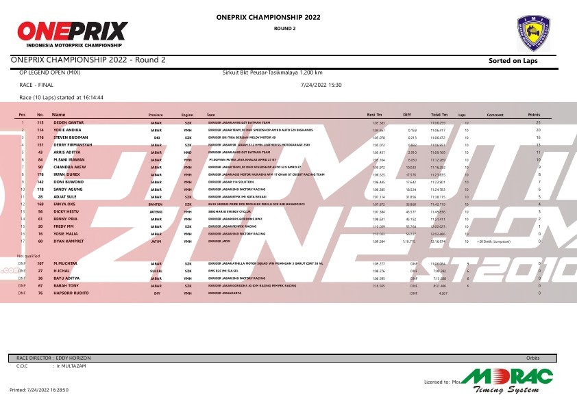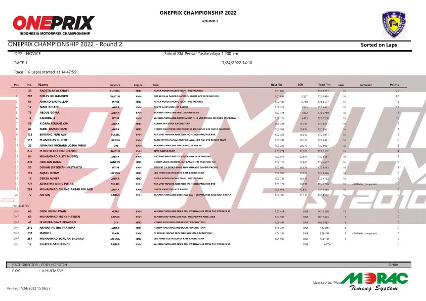 OtomotifZone.com – Tasikmalaya. Usai sudah gelaran Oneprix Seri 2 yang diselenggarakan (23-24/7/22) di Sirkuit Bukit Peusar Tasikmalaya, Jawa Barat. Pada gelaran ini sangat seru. Balapan dijalani dengan kondisi sirkuit basah. Tapi balapan berjalan dengan sukses. Berikut hasil lengkapnya: