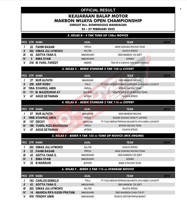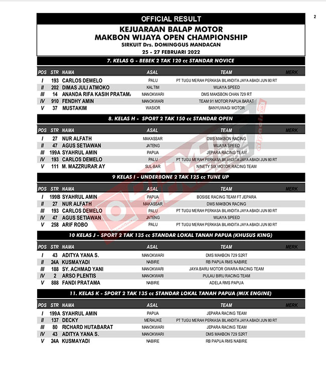 Berikut merupakan Hasil Lomba Keseluruhan Kejuaraan Balap Motor Makbon Wijaya Championship adalah sebagai berikut: