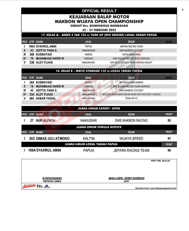 OtomotifZone.Com – Manokwari. Ajang balap motor bertajuk Kejuaraan Balap Motor Makbon Wijaya Championship yang berlangsung di sirkuit Drs.Dominggus Mandacan Manokwari Papua Barat, Minggu (27/02) telah usai dan berjalan dengan lancar .