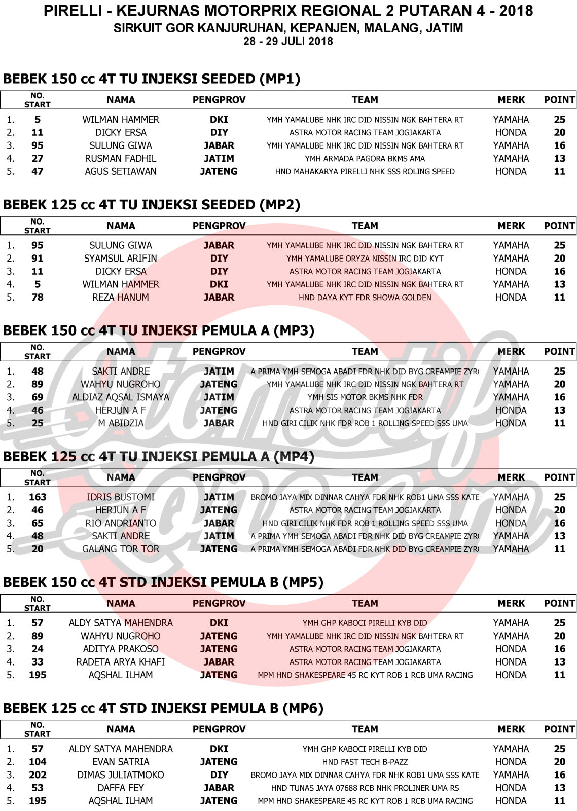 Race ResultsRacing Roda 2Road Race Hasil Lomba lengkap PIRELLI – KEJURNAS MOTORPRIX REGIONAL 2 PUTARAN 4 – 2018 Malang Penulis otomotifzone - 29 Juli 2018 0 8300 FacebookXPinterestWhatsApp Podium MP2 OtomotifZone.com – Malang. Berikut Hasil lengkap PIRELLI – KEJURNAS MOTORPRIX REGIONAL 2 PUTARAN 4 – 2018. Yang diselenggarakan di pelataran Stadion Kanjuruhan Kepanjen – Kabupaten Malang. Sabtu – Minggu, 28 – 29 JULI 2018. Foto : DIKi