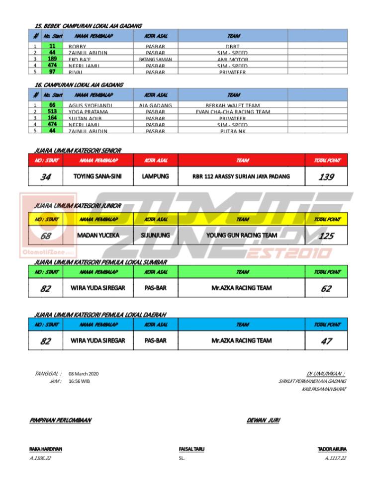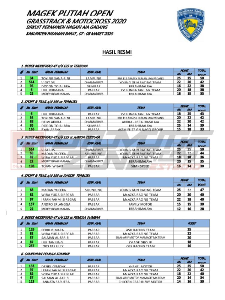 Race Results Hasil Lomba Magek Putiah Open Grasstrack & Motocross 2020 Pasaman Barat Penulis OtomotifZone.com - 10 Maret 2020 0 363 FacebookXPinterestWhatsApp Berikut adalah hasil lomba Magek Putiah Open Grasstrack & Motocross 2020 yang berlangsung di sirkuit Nagari Aia Gadang, Kabupaten Pasaman Barat, Sumatera Barat, (7-8/3).