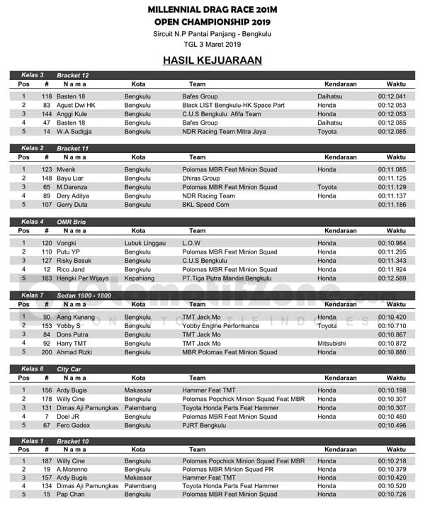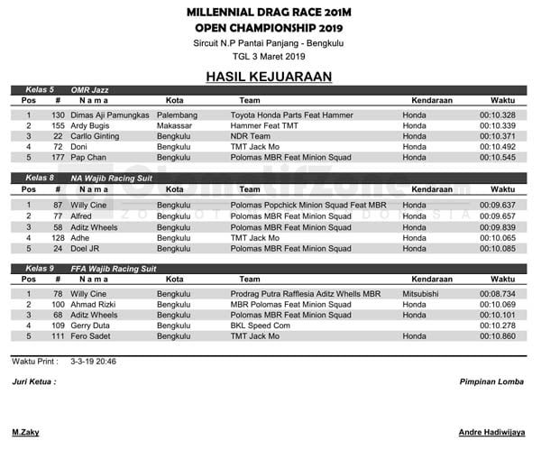 Racing Roda 4Drag RaceRace Results Hasil Lomba Millennial Drag Race 201M Open Championship 2019 Bengkulu Penulis OtomotifZone.com - 4 Maret 2019 0 1285 FacebookXPinterestWhatsApp OtomotifZone.com – Bengkulu. Berikut ini adalah Hasil Lomba Millennial Drag Race 201M Open Championship 2019 Bengkulu yang berlangsung di sirkuit Pantai Panjang, Kota Bengkulu, Minggu (3/3). Penulis : Hardiansyah |Foto : Hardiansyah