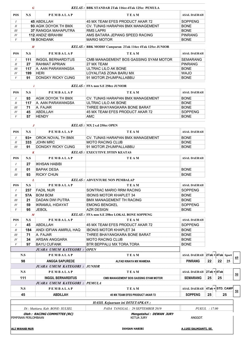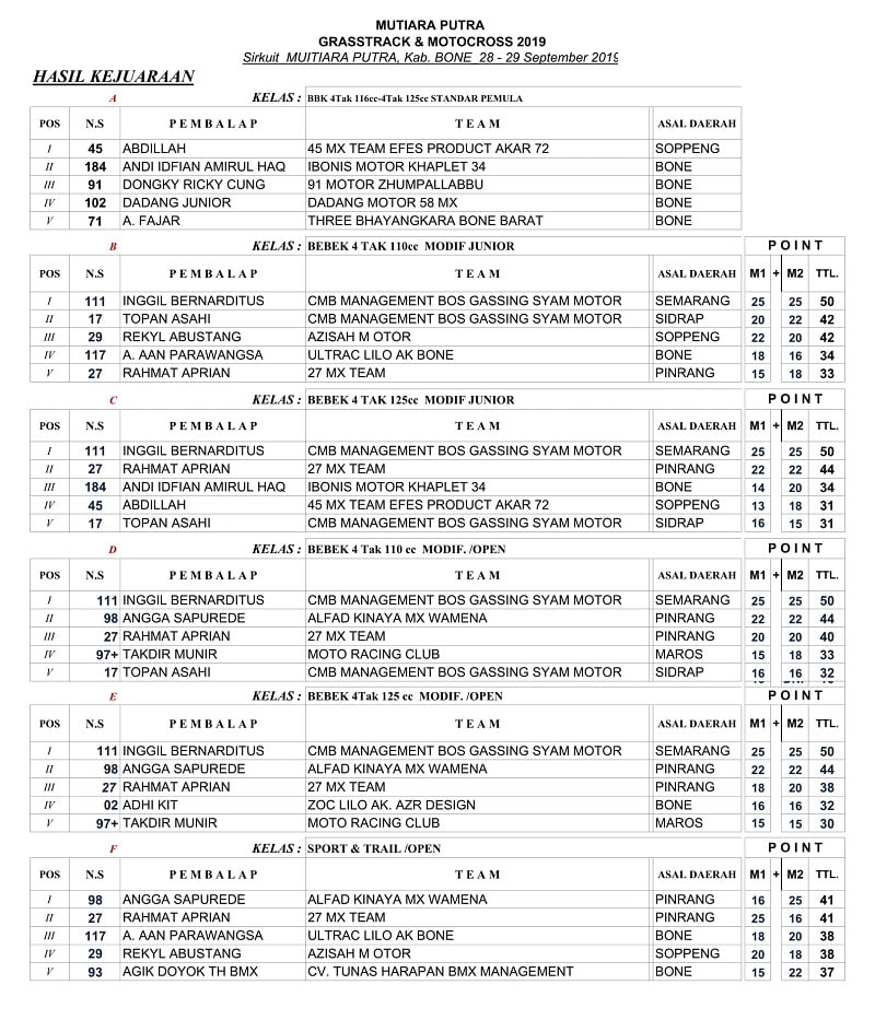 OtomotifZone.com – Sulawesi Selatan. Berikut ini adalah hasil lomba Mutiara Putra Grasstrack & Motocross 2019 yang berlangsung di sirkuit Mutiara Putra, Bone, Sulawesi Selatan, Minggu (29/9).