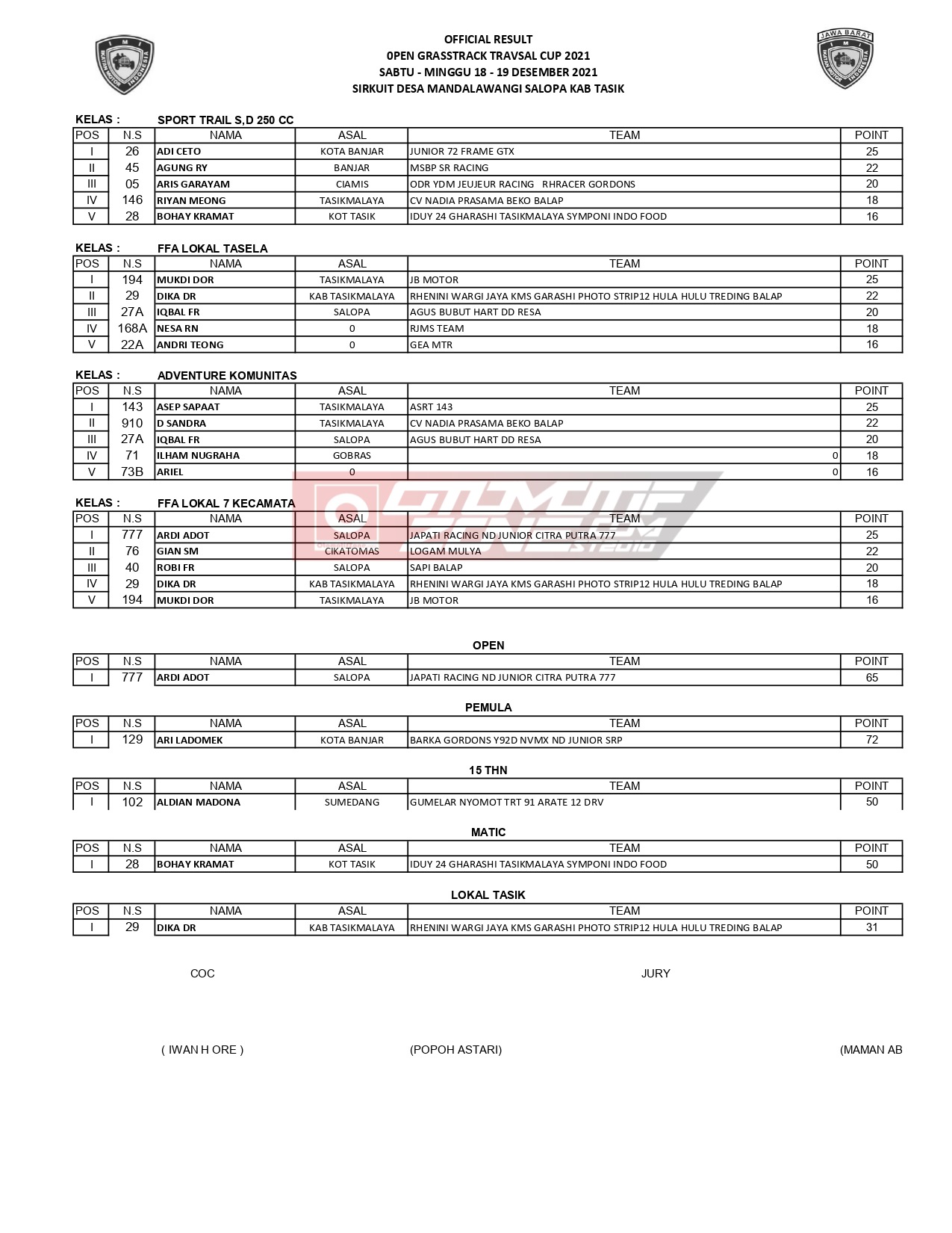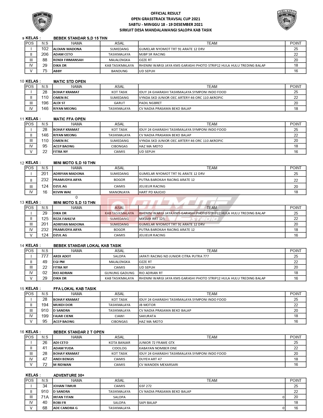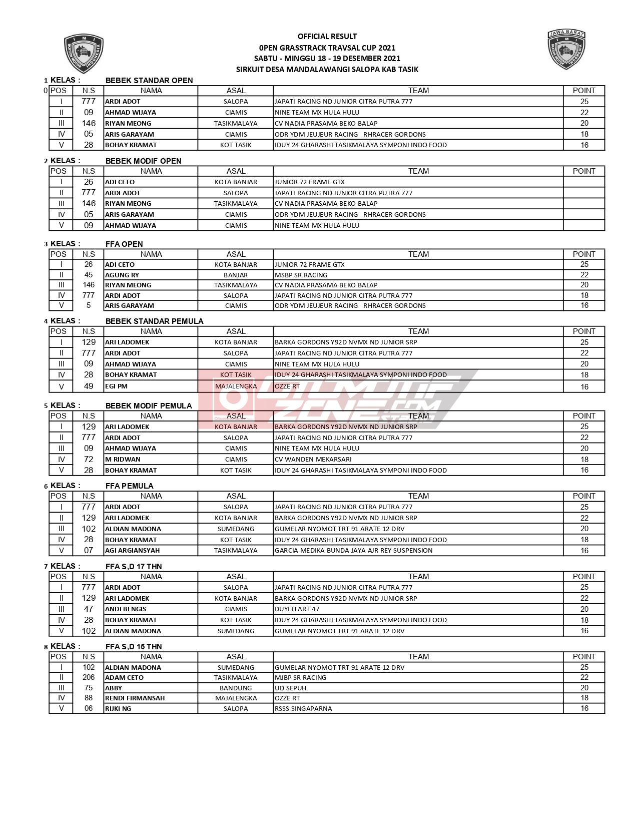 OtomotifZone.com – Tasikmalaya. Dari hasil lomba Open Grasstrack Travsal Cup 2021 di sirkuit Bukit Saga, Desa Mandalawangi, Salopa, Kabupaten Tasikmalaya, Jawa Barat, (18-19/12) diikuti sebanyak 182 starter. Para petarung balap di lintasan tanah ini, bersaing di 21 kelas yang dengan dilombakan.