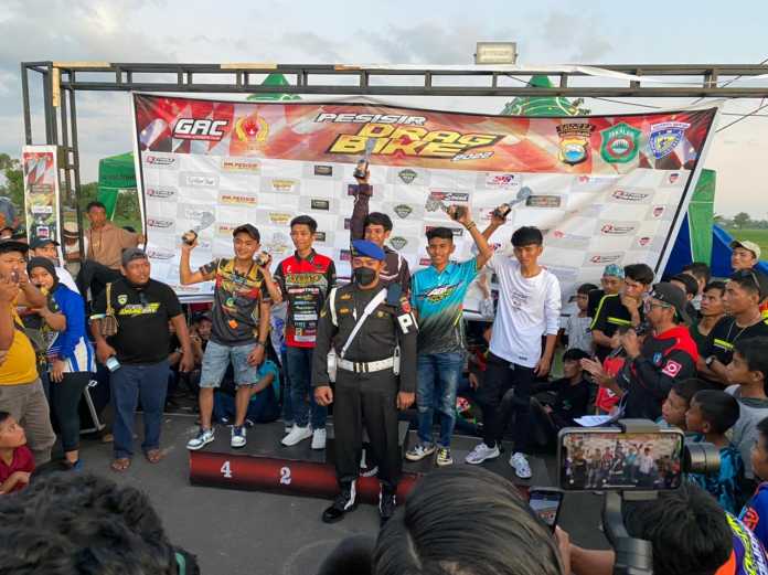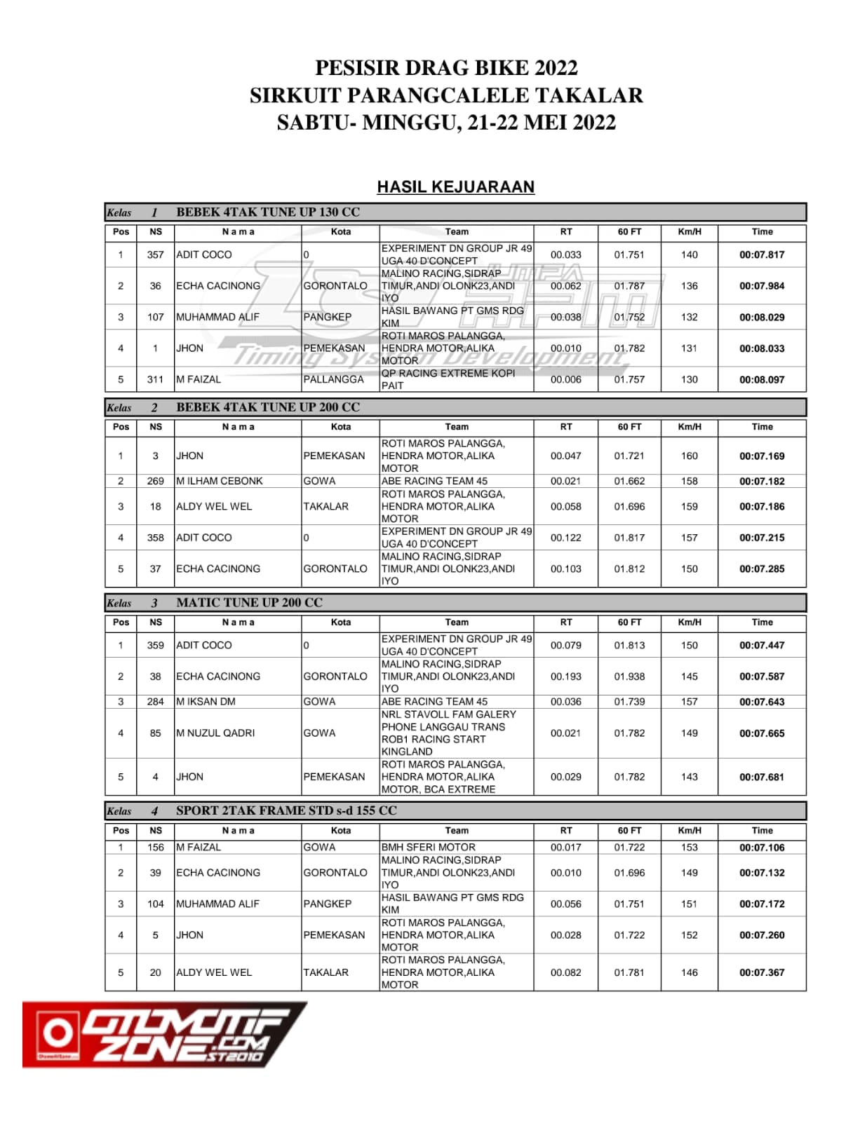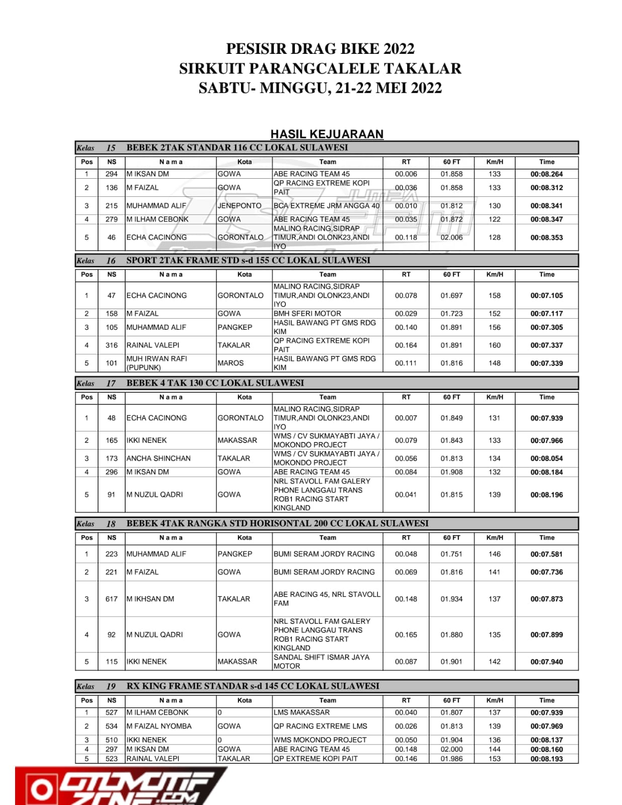 OtomotifZone.com – Takalar. Usai sudah gelaran Pesisir Drag Bike Takalar 2022 yang berlangsung (21-22/5/22) di Sirkuit Parangcalele , Takalar, Sulawesi Selatan. Pada kejuaraan ini pebalap pebalap lokal Daerah mendapatkan tantangan baru dengan hadirnya beberapa pebalap dari pulau Jawa. Tapi itu tidak membuat pebalap pebalap Sulawesi gentar. Mereka tetap gaspol dan berhasil mematahkan sepak terjang pebalap pebalap asal Jawa. Untuk info lebih lengkap mengenai juara, berikut daftar juara disetiap kelasnya: