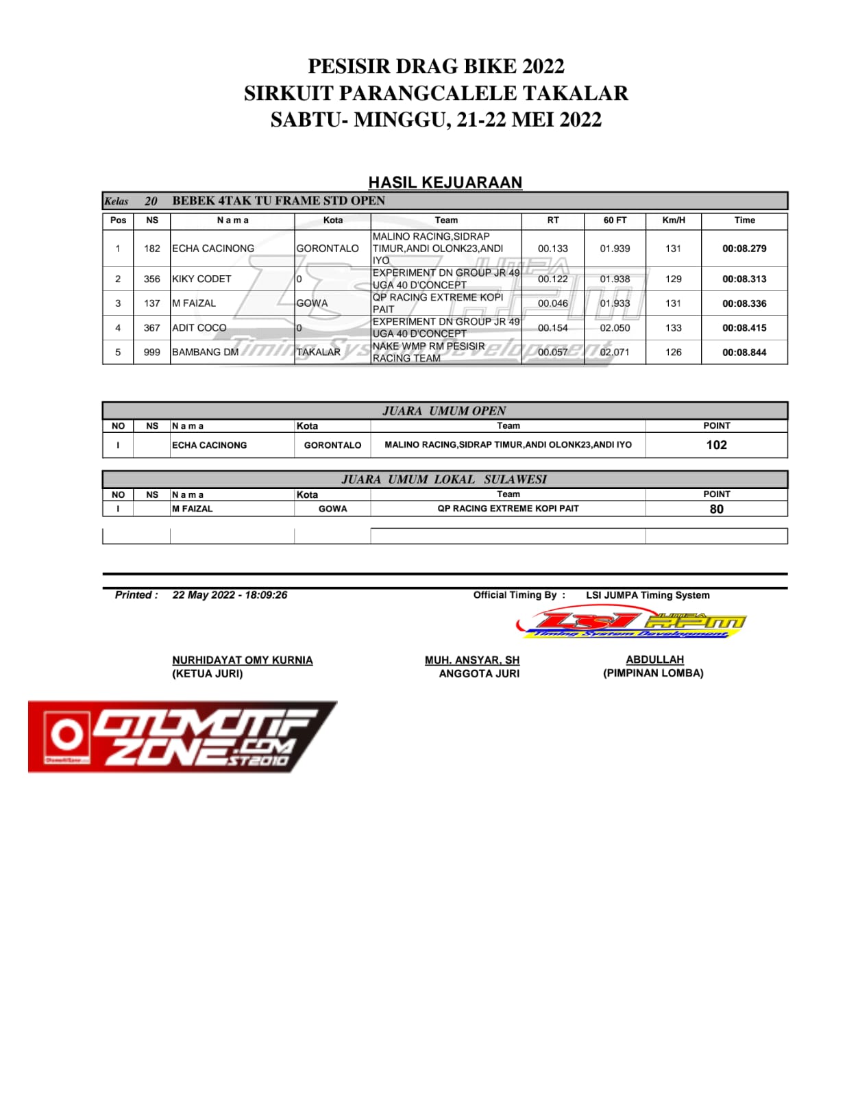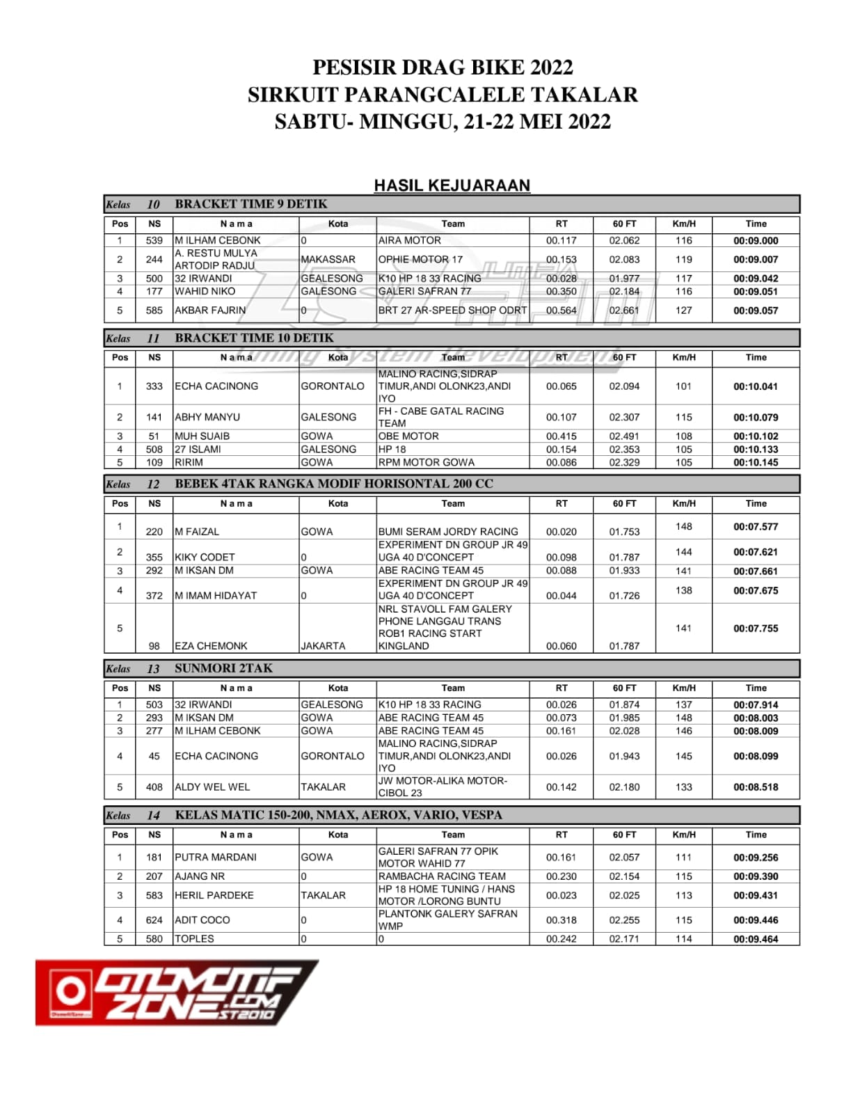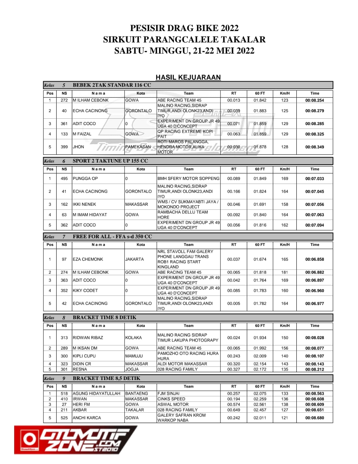 OtomotifZone.com – Takalar. Usai sudah gelaran Pesisir Drag Bike Takalar 2022 yang berlangsung (21-22/5/22) di Sirkuit Parangcalele , Takalar, Sulawesi Selatan. Pada kejuaraan ini pebalap pebalap lokal Daerah mendapatkan tantangan baru dengan hadirnya beberapa pebalap dari pulau Jawa. Tapi itu tidak membuat pebalap pebalap Sulawesi gentar. Mereka tetap gaspol dan berhasil mematahkan sepak terjang pebalap pebalap asal Jawa. Untuk info lebih lengkap mengenai juara, berikut daftar juara disetiap kelasnya: