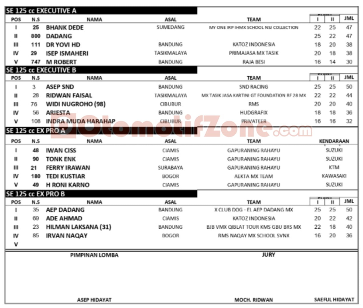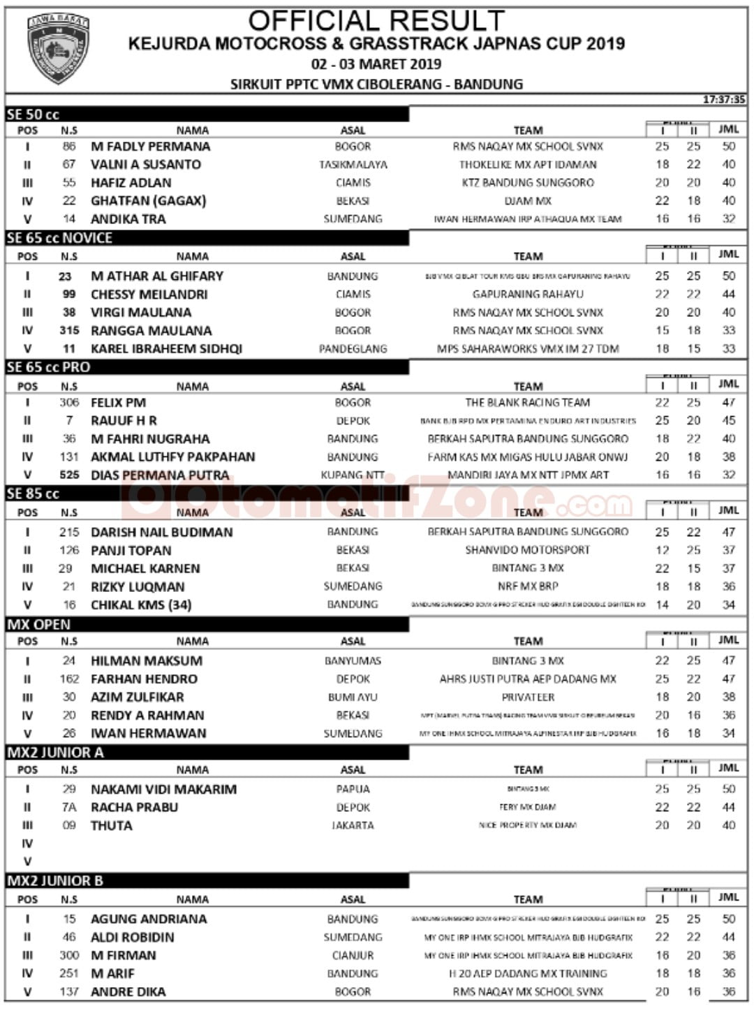 OtomotifZone.com – Bandung. Usai sudah gelaran balap motor tanah dan lumpur dalam ajang PPTC Phol’s Kejurda Motocross 2019 Seri I Minggu yang berlangsung di sirkuit PPTC Cibolerang, Kota Bandung, Jawa Barat, (2-3/3). Berikut adalah hasil lomba selengkapnya.