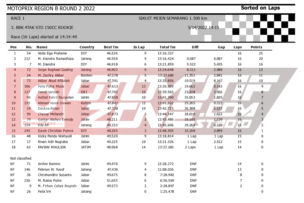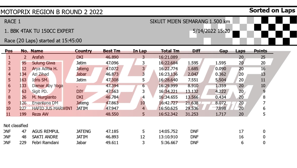 OtomotifZone.com – Semarang. Usai sudah hari pertama penyelenggaraan Kejurnas Motoprix region Jawa putaran 2 yang berlangsung (14/5/22) di Sirkuit Mijen Semarang, Jawa Tengah. Yang mana event ini akan diselenggarakan selama dua hari sampai (15/5/22). Dan pada hari pertama dilaksanakan race 1 di semua kelas Kejurnas. Berikut hasil lombanya: