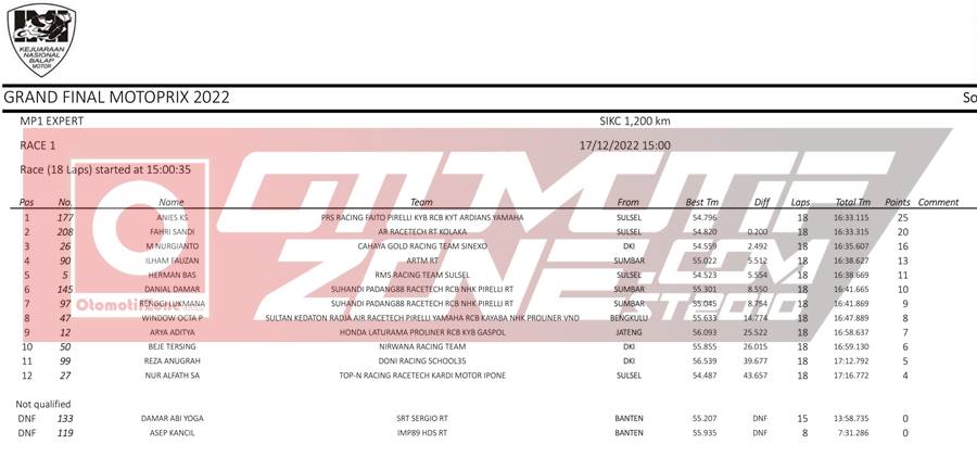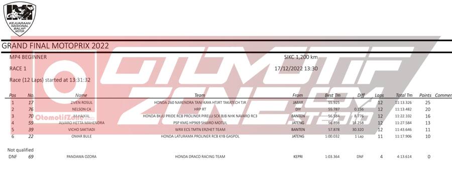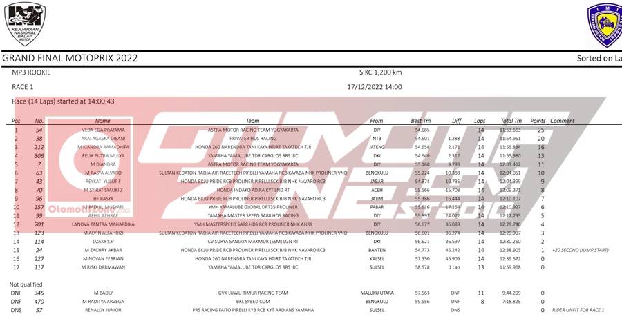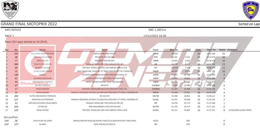 OtomotifZone.com – Sentul. Usai sudah sesi hari pertama Piala Presiden Grand Final Motoprix yang berlangsung (17/12/22) di Sirkuit Internasional Karting Sentul, Bogor. Pada gelaran ini pebalap dari luar pulau Jawa ikut bertarung untuk merebutkan gelar juara Nasional. Jawara jawara setiap region hadir untuk menjadi yang terbaik. Berikut hasil lomba race 1: