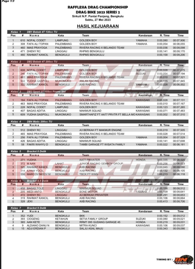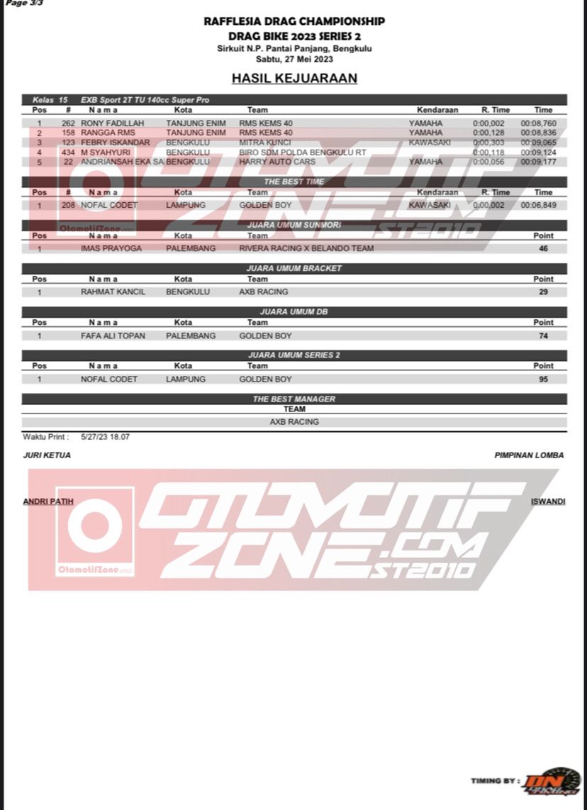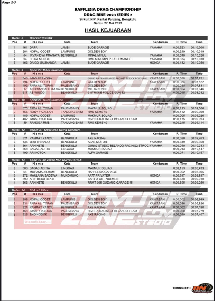 Otomotifzone.com-Bengkulu. Berikut adalah hasil lomba Rafflesia Drag Championship Drag Bike seri 2 yang dilaksanakan di sirkuit non permanen Pantai Panjang, Bengkulu pada Sabtu (27/05/23).
