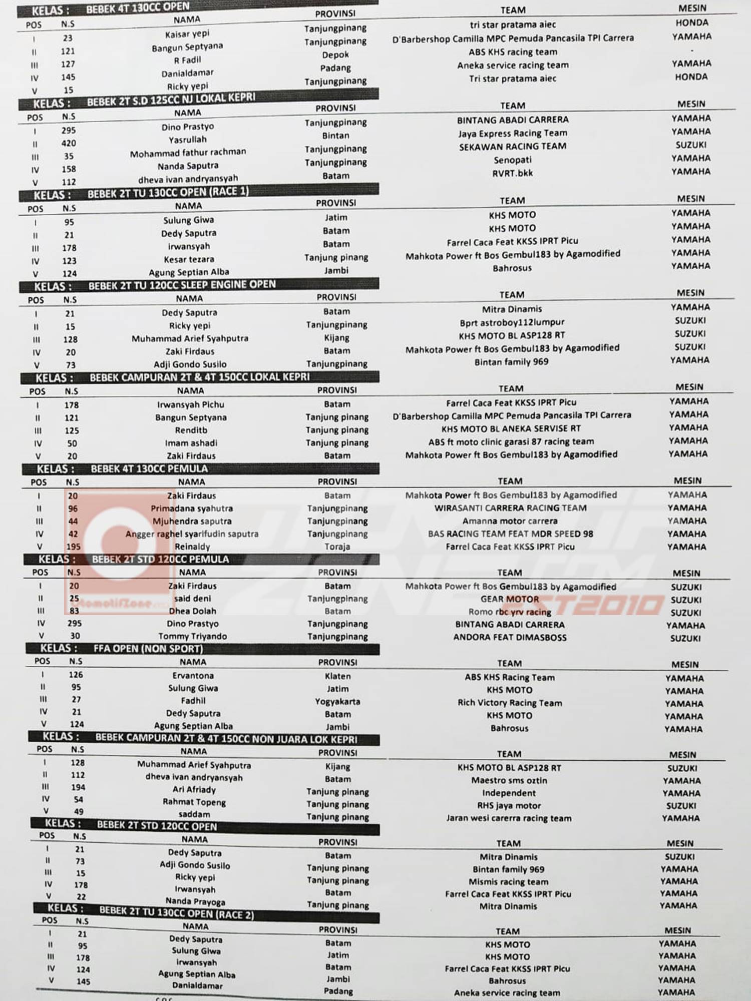 Semua pebalap ternama ini juga ikut memanaskan persaingan di kelas yang diperlombakan. Persaingan seru dan jalannya balapan seru ditambah dengan pembawa acara kondang Sumatera yang membawakan acara siapa lagi kalau bukan Arissandro. Acara sangat seru dinikmati dan sisksikan. Agar lebih jelas, berikut hasil lombanya: