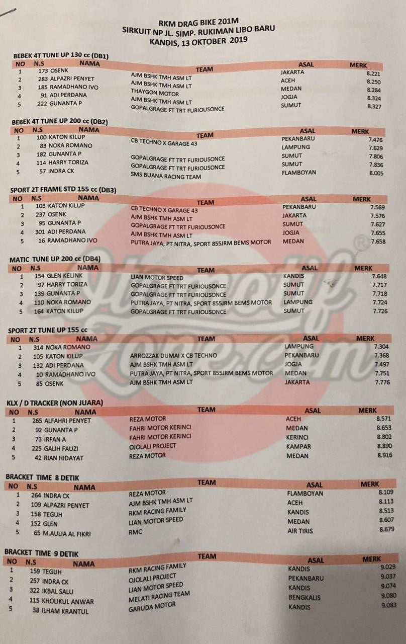 OtomotifZone.com – Pekanbaru. Usai sudah gelaran RKM Drag Bike 2019 yang berlangsung (13/10) di Sirkuit NP JL. Simp, Rukiman Libo Baru, Riau. Persaingan sengit dengan hadirnya beberapa artis Drag Bike Indonesia digelaran ini.
