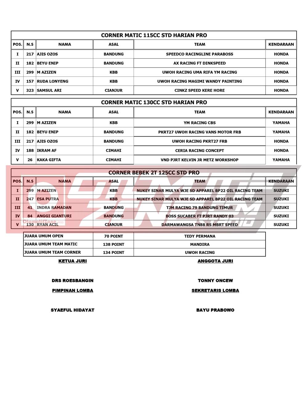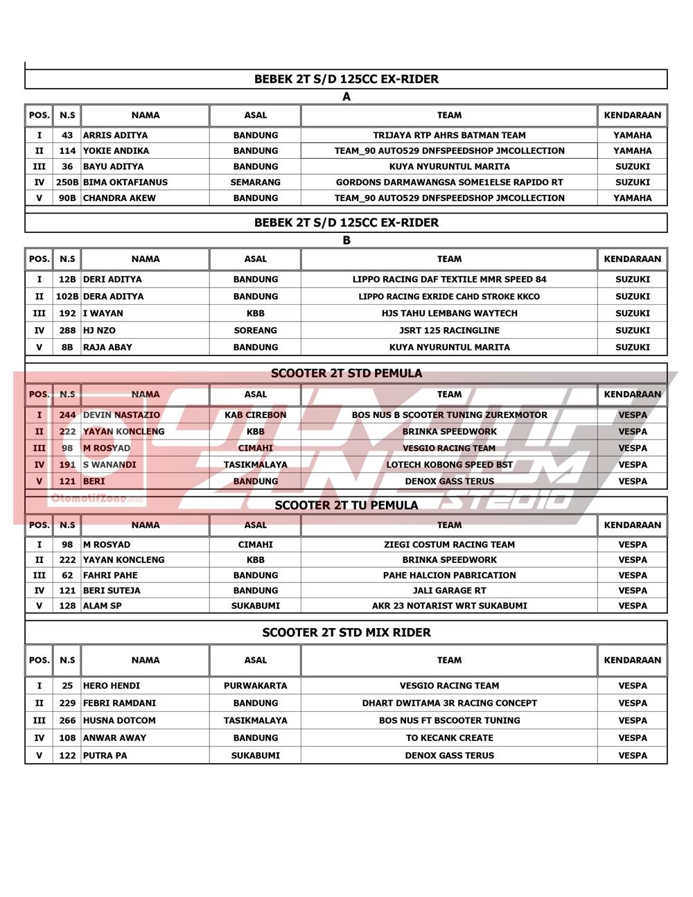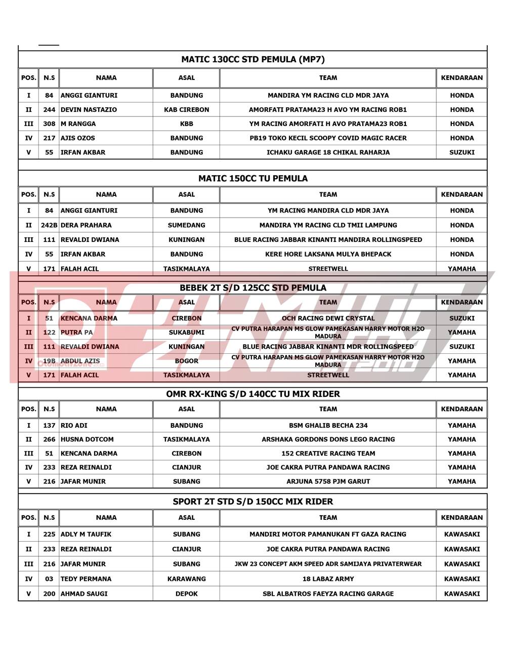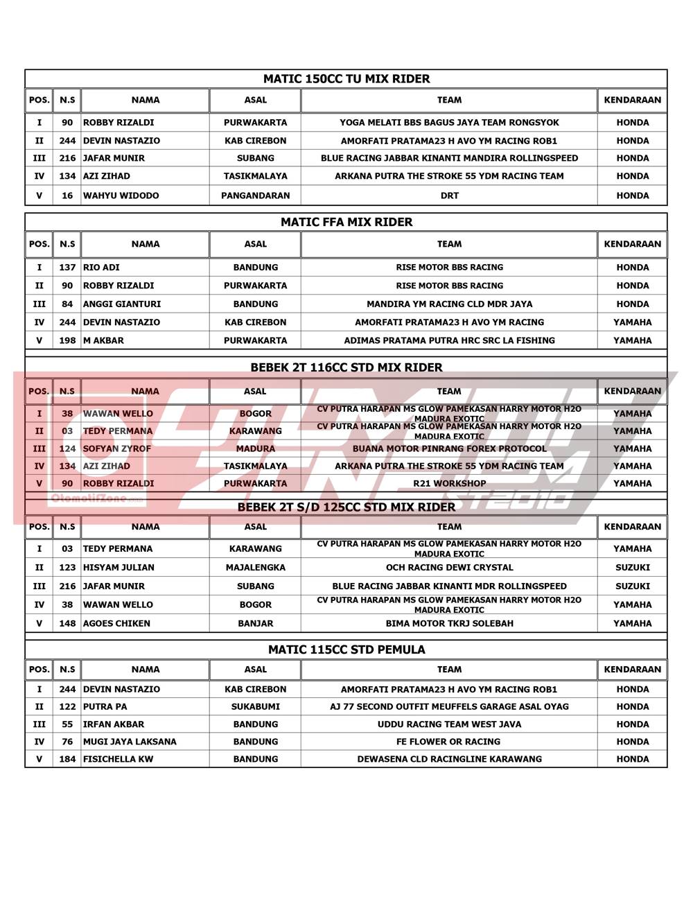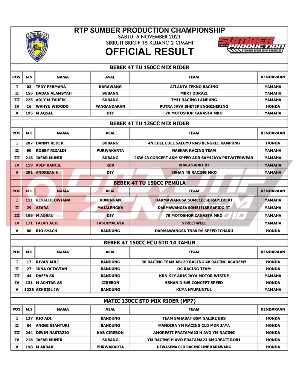 Pebalap terbaik keluar sebagai juaranya. Agar lebih jelas, berikut hasil lomba RTP Sumber Production Championship 2021: