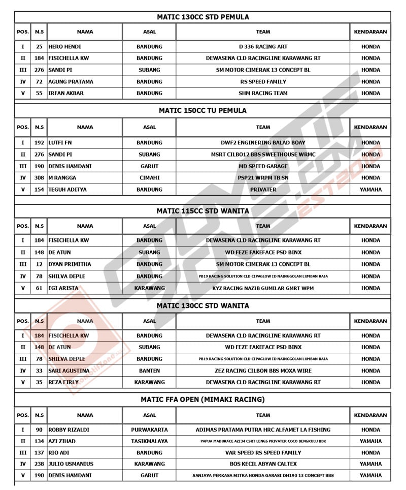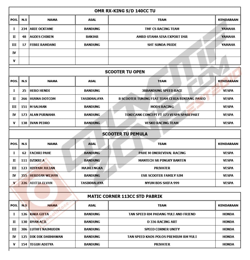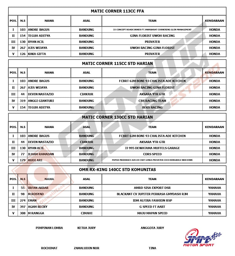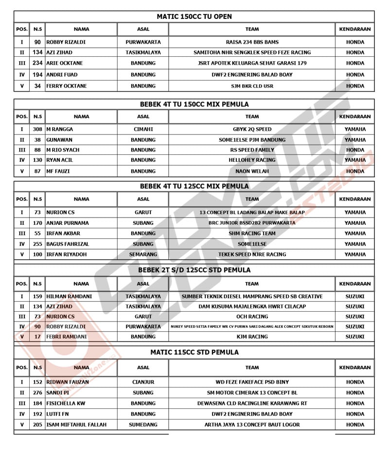 Otomotifzone.com – Cimahi. Berikut ini adalah hasil lomba RTP6 Open Road Race Sumber Production 2019 yang berlangsung di sirkuit Brigif 15 Kujang II Cimahi, Bandung, Sabtu (26/10).