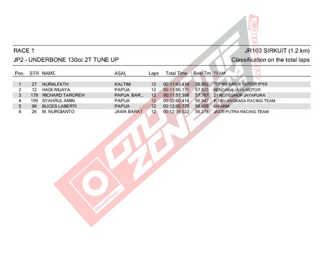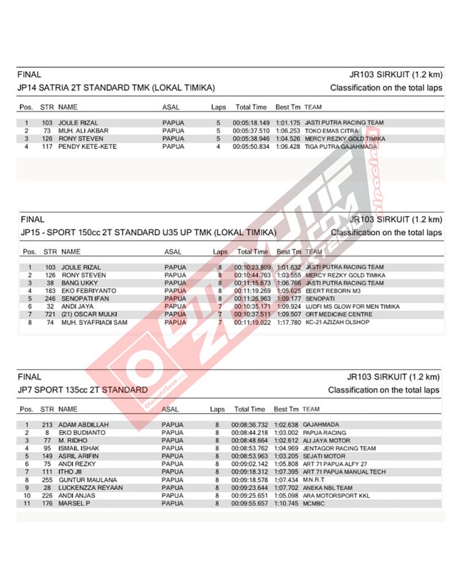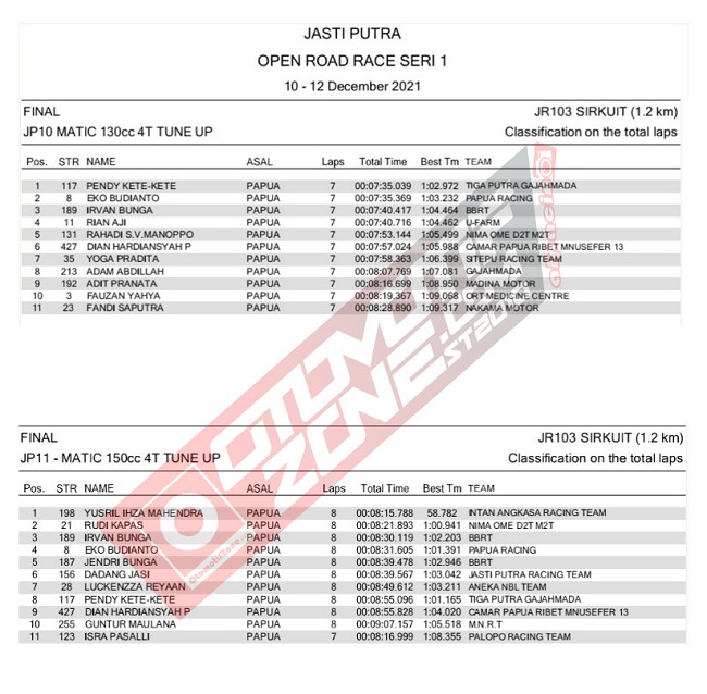 OtomotifZone.Com – Timika. Dari Hasil Lomba Sabtu (11/12), persaingan sengit kembali diperlihatkan oleh peserta dihari kedua pada sirkuit JR 103 Timika, dengan mendapatkan hasil yang maksimal dari kelas yang dilombakan.